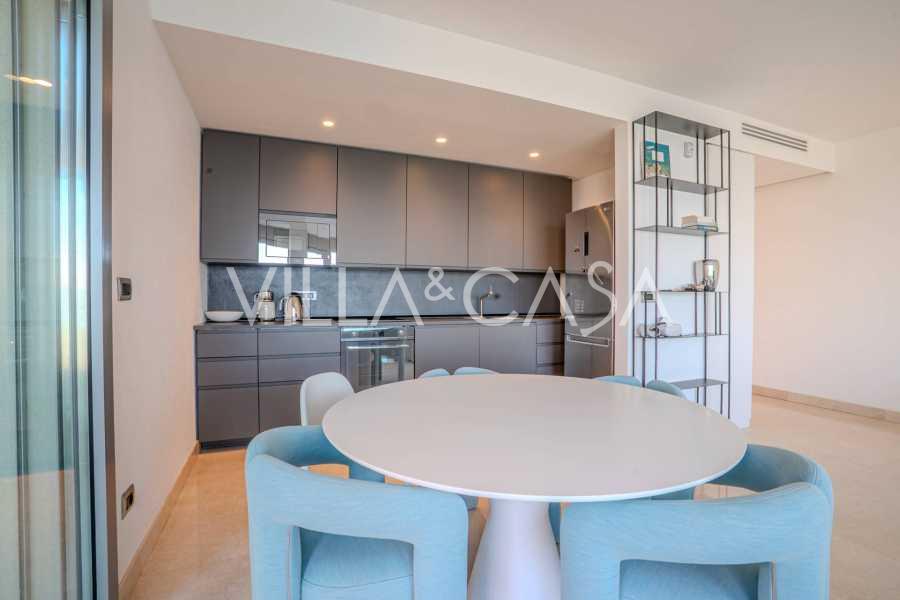 Апартаменты находятся на первом этаже элитной резиденции с лифтом и включают: просторную прихожую, светлую гостиную с кухней и выходом на террасу с видом на море, две спальни, каждая из которых имеет выход на террасу, а также две ванные комнаты, одна из которых оборудована ванной.