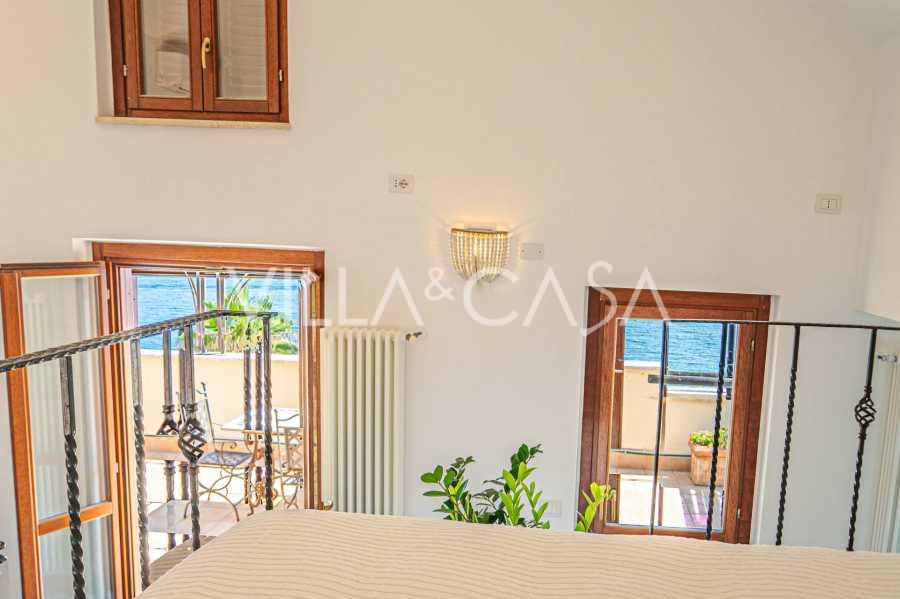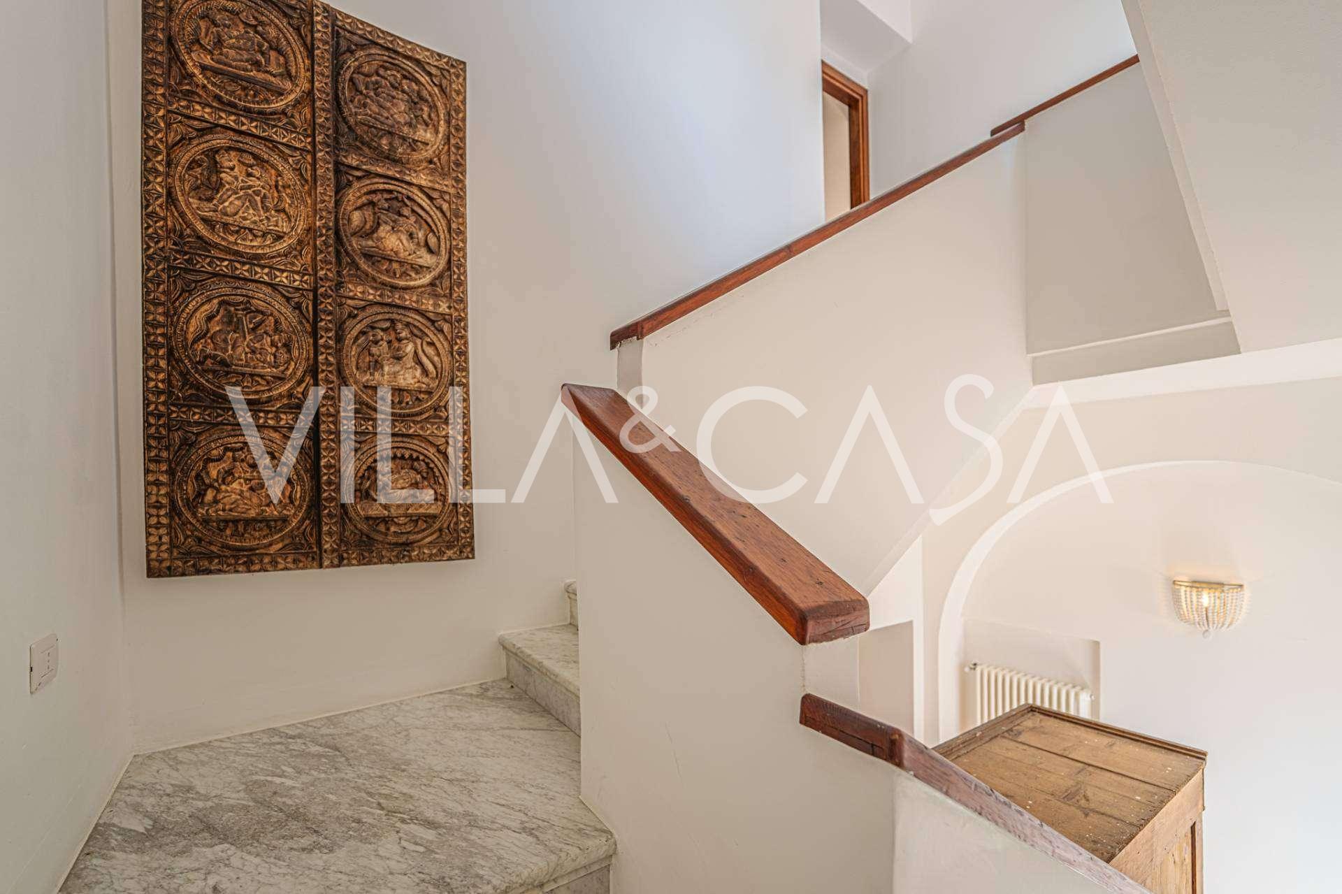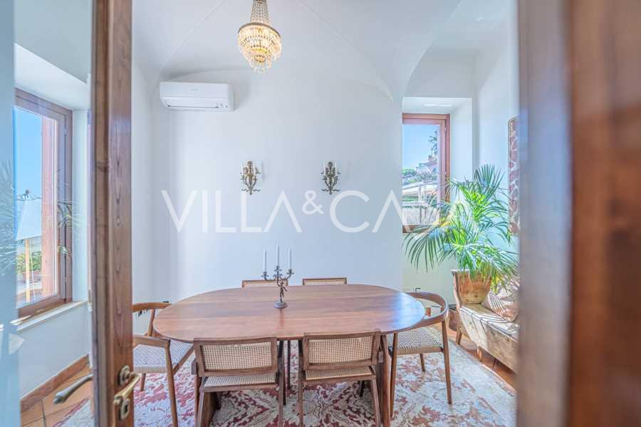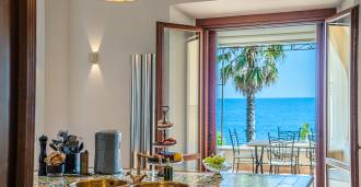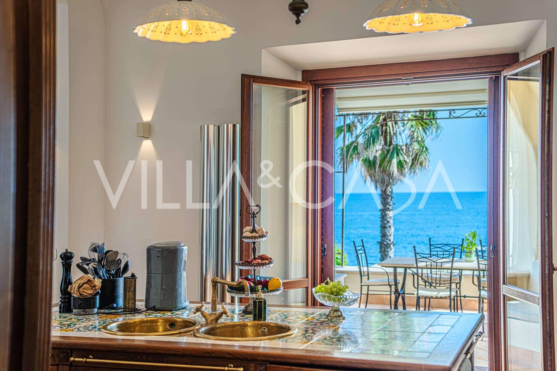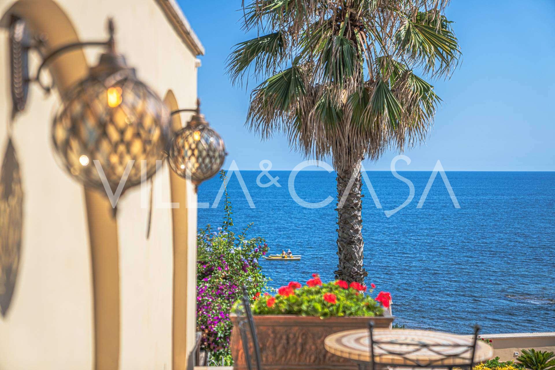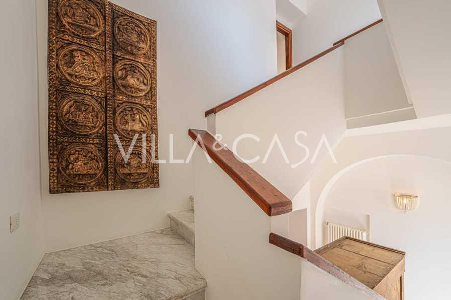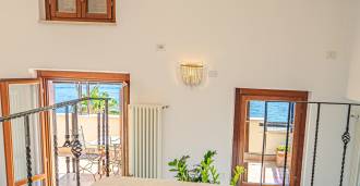 Окна предлагают панорамный 180-градусный вид на море, синий горизонт заполняет каждое внутреннее пространство и простирается до широких панорамных террас. Внутренние помещения, с высокими потолками более трех метров, терракотовыми полами того времени, мраморной лестницей и камином, создают атмосферу изысканной, вечной элегантности.
