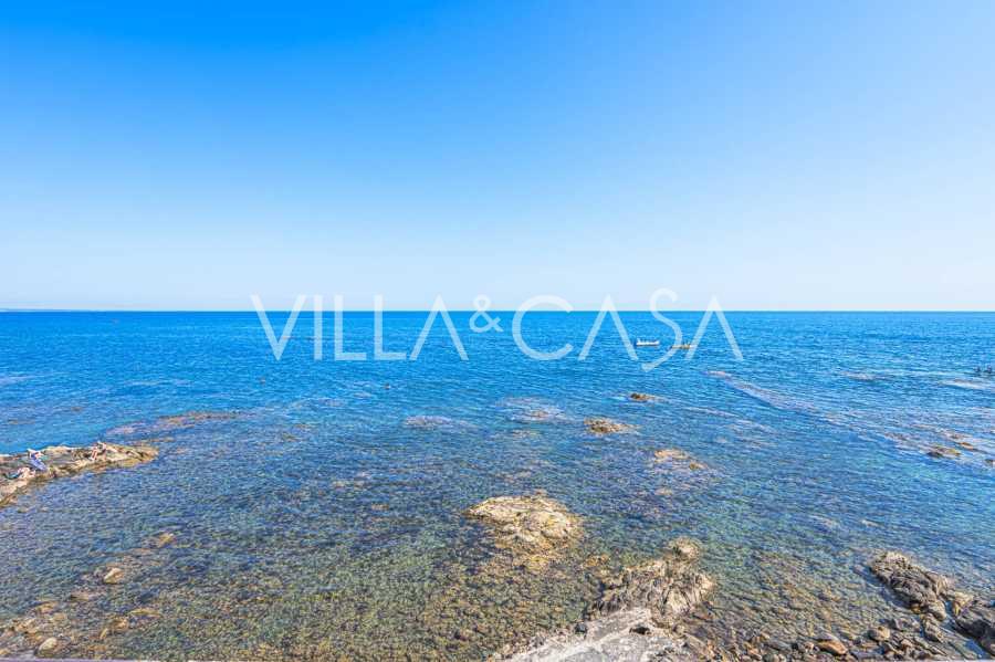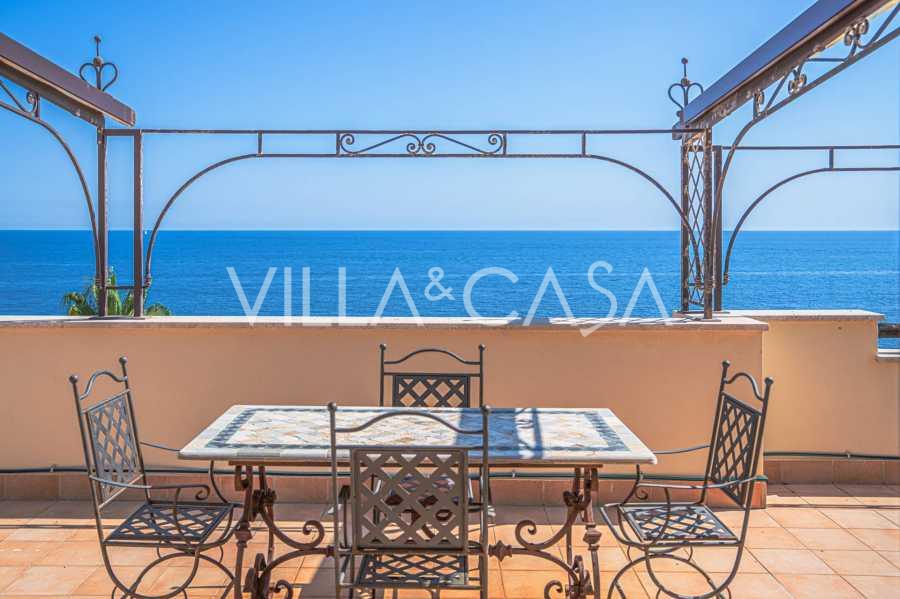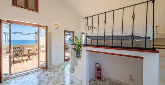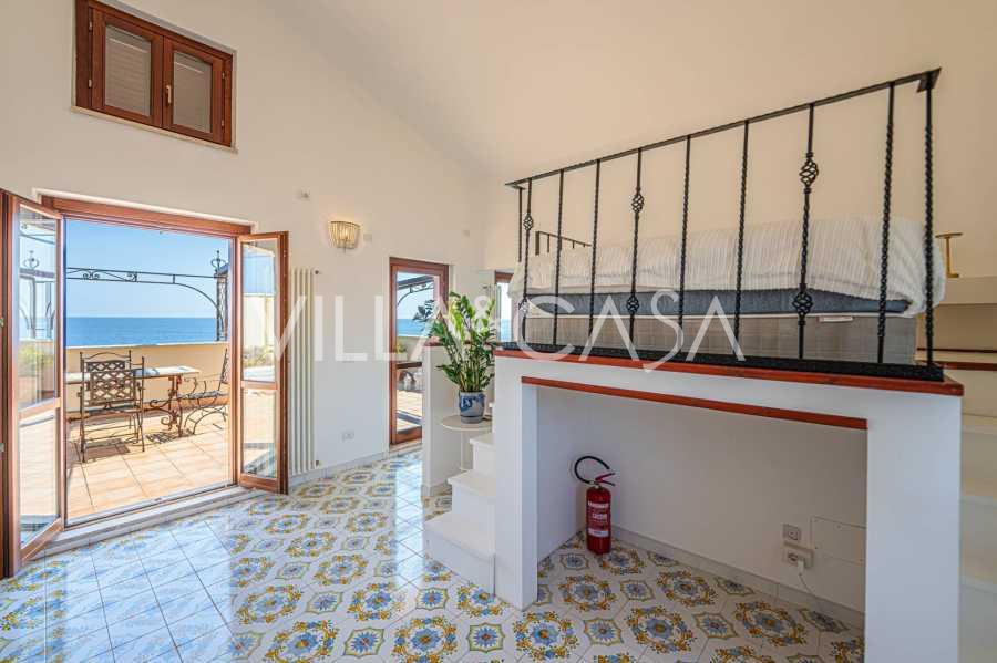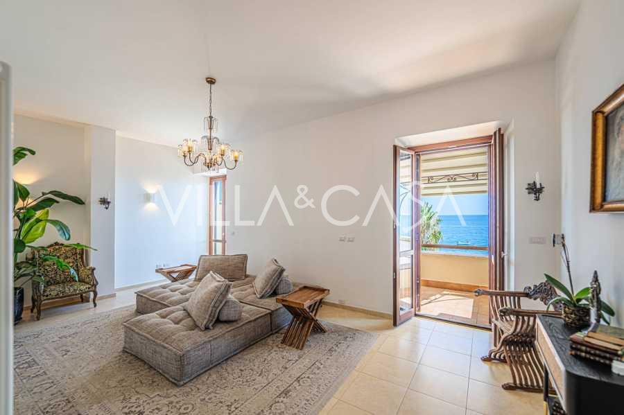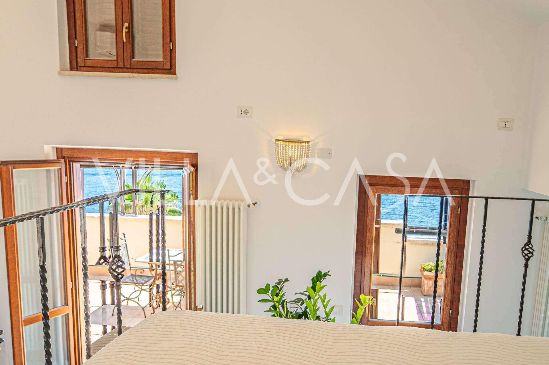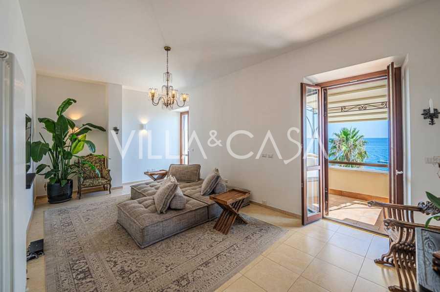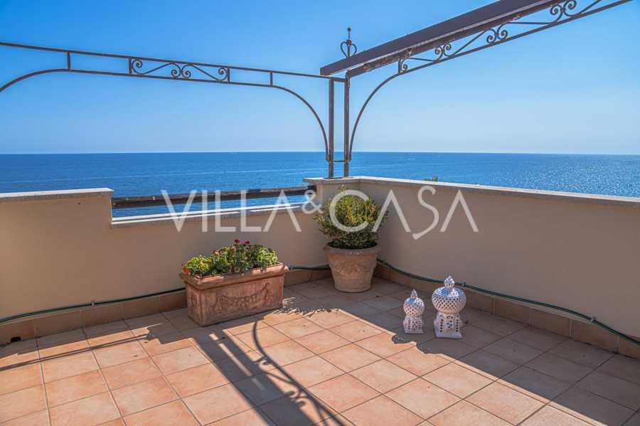 Окна предлагают панорамный 180-градусный вид на море, синий горизонт заполняет каждое внутреннее пространство и простирается до широких панорамных террас. Внутренние помещения, с высокими потолками более трех метров, терракотовыми полами того времени, мраморной лестницей и камином, создают атмосферу изысканной, вечной элегантности.