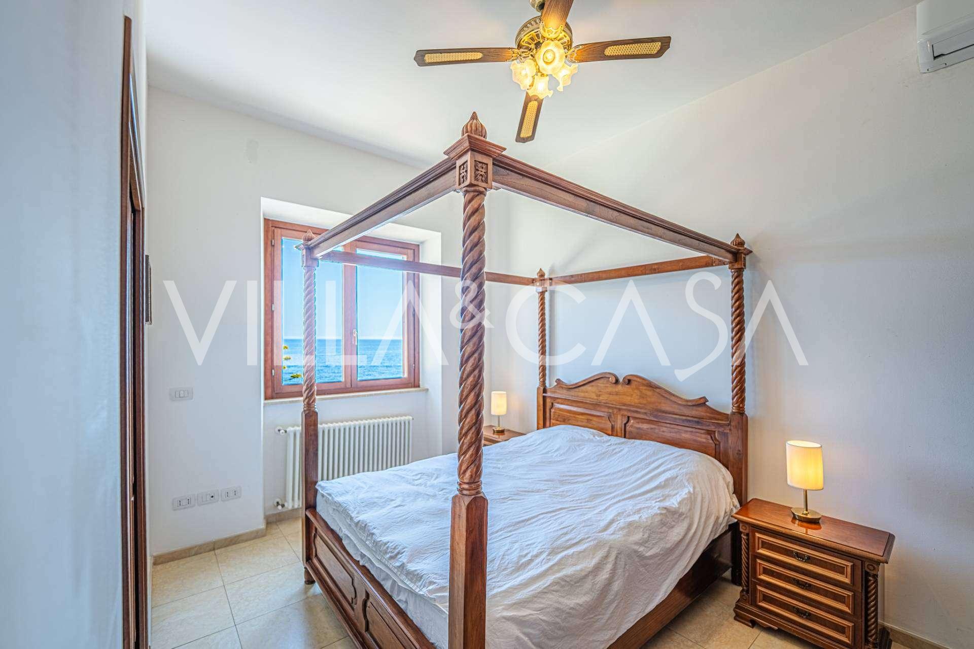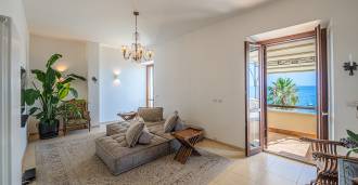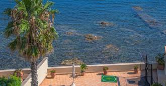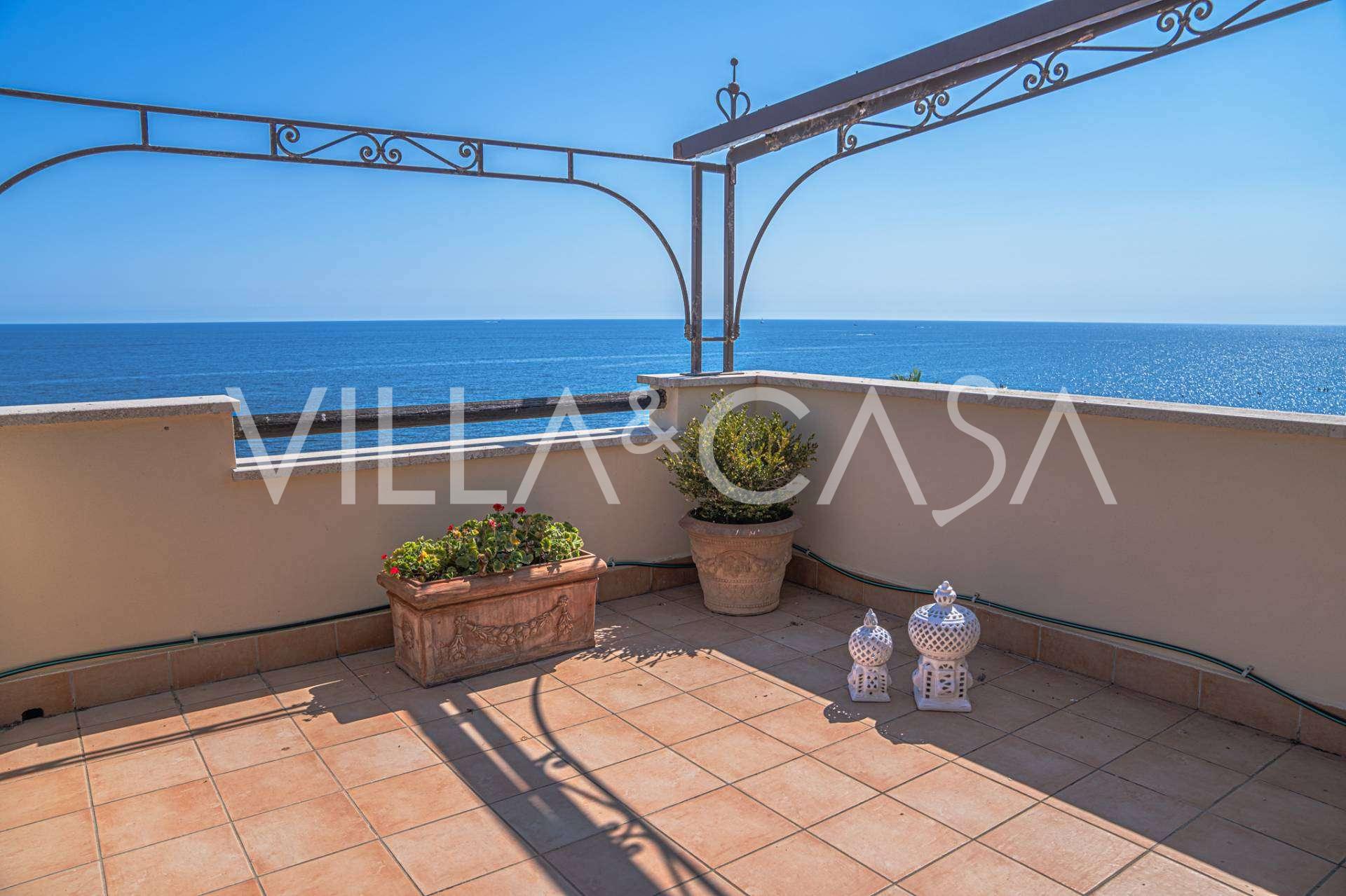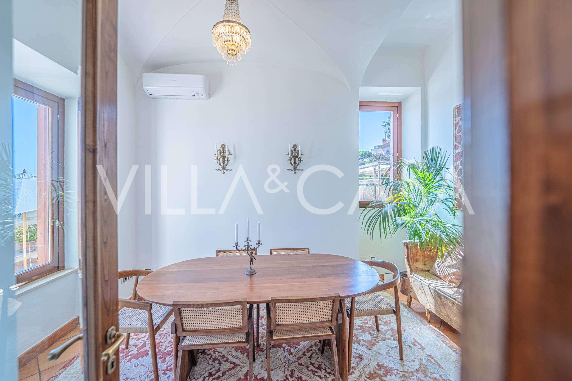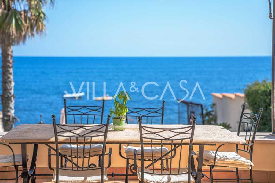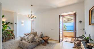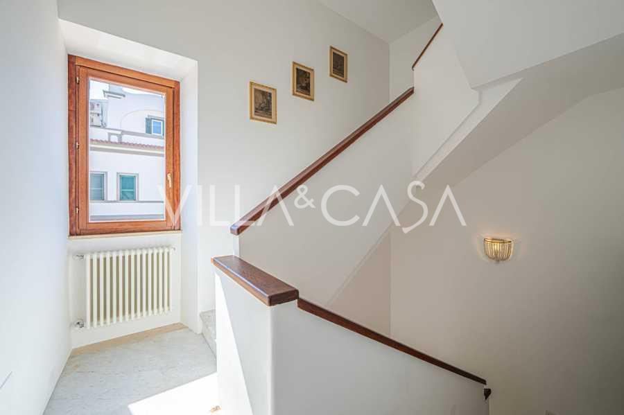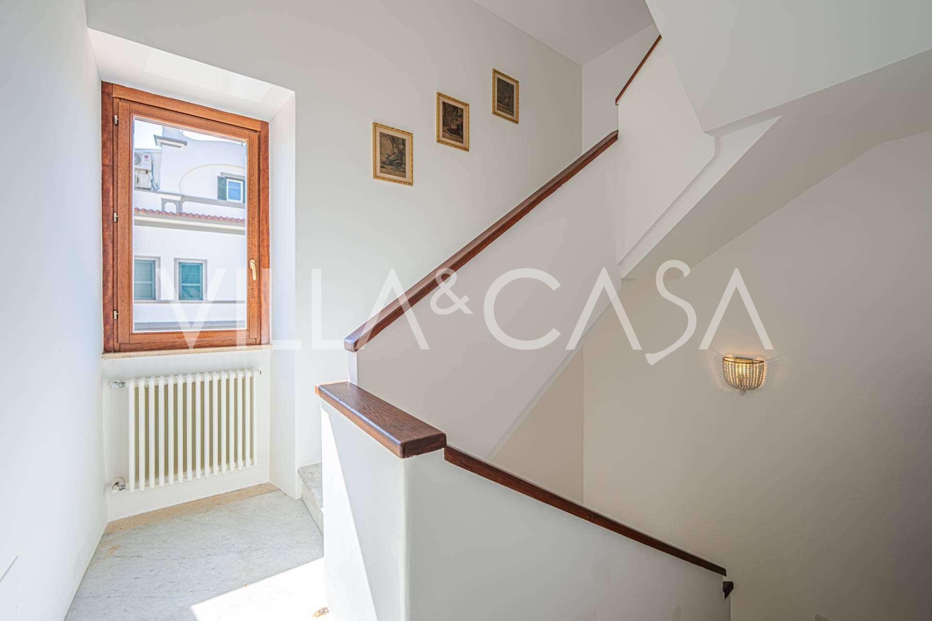 Окна предлагают панорамный 180-градусный вид на море, синий горизонт заполняет каждое внутреннее пространство и простирается до широких панорамных террас. Внутренние помещения, с высокими потолками более трех метров, терракотовыми полами того времени, мраморной лестницей и камином, создают атмосферу изысканной, вечной элегантности.