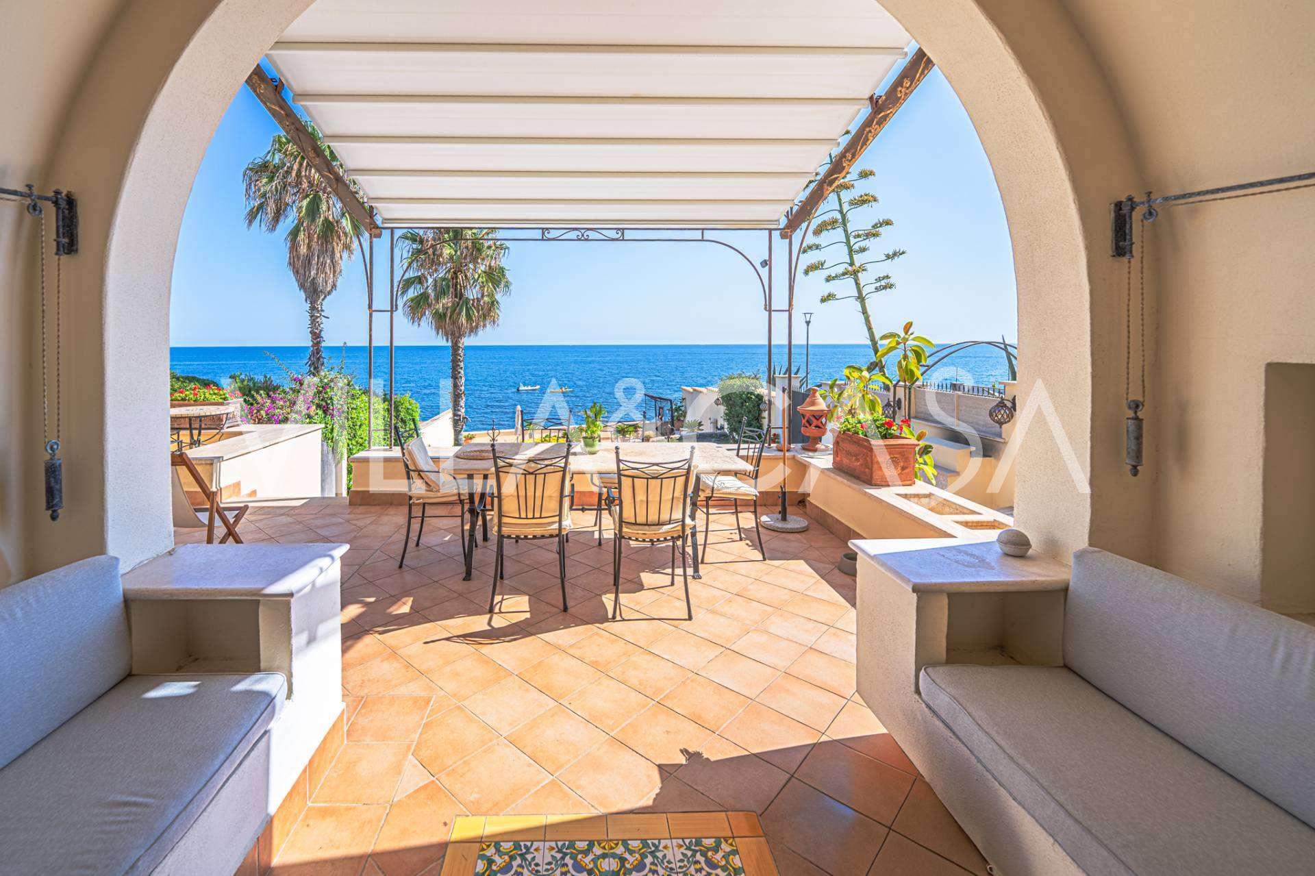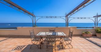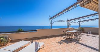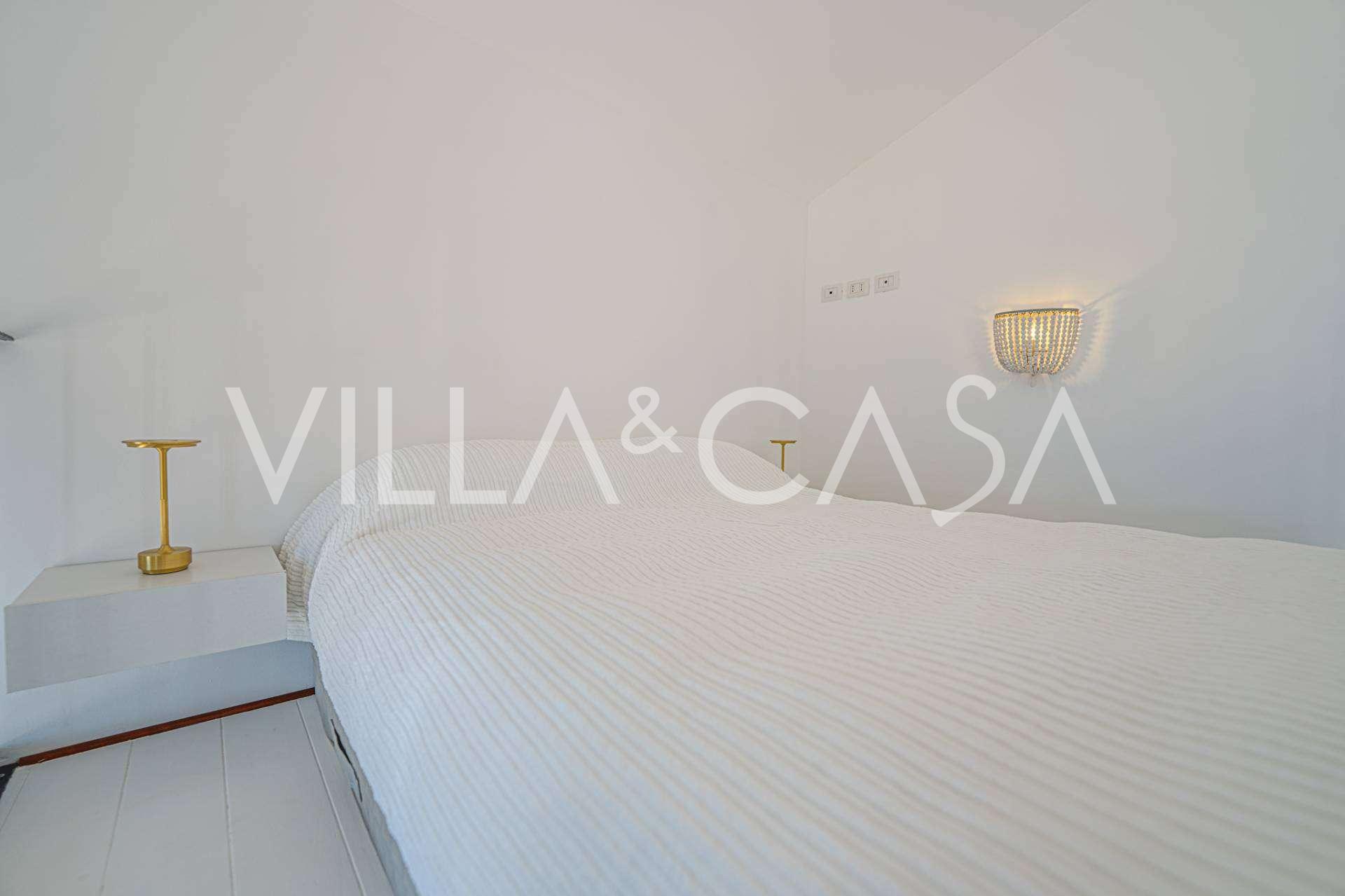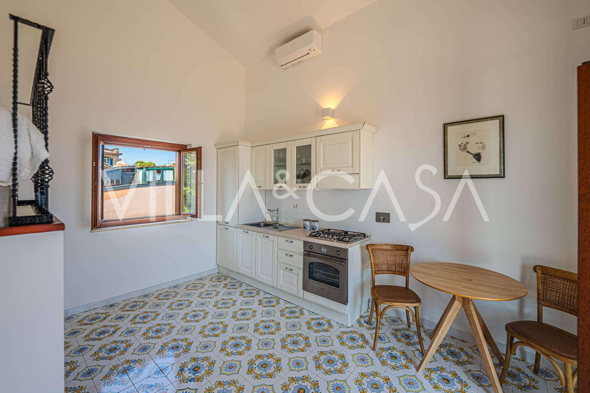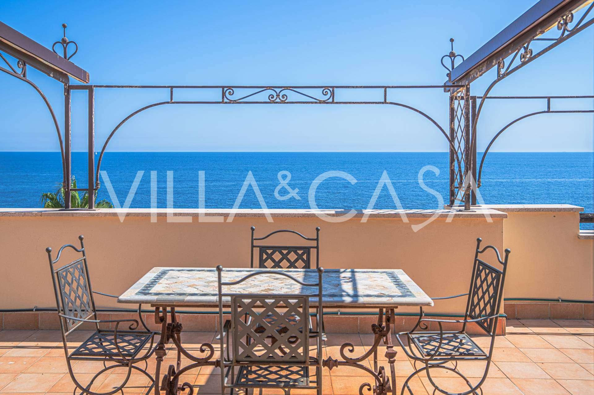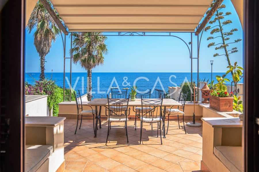 Окна предлагают панорамный 180-градусный вид на море, синий горизонт заполняет каждое внутреннее пространство и простирается до широких панорамных террас. Внутренние помещения, с высокими потолками более трех метров, терракотовыми полами того времени, мраморной лестницей и камином, создают атмосферу изысканной, вечной элегантности.