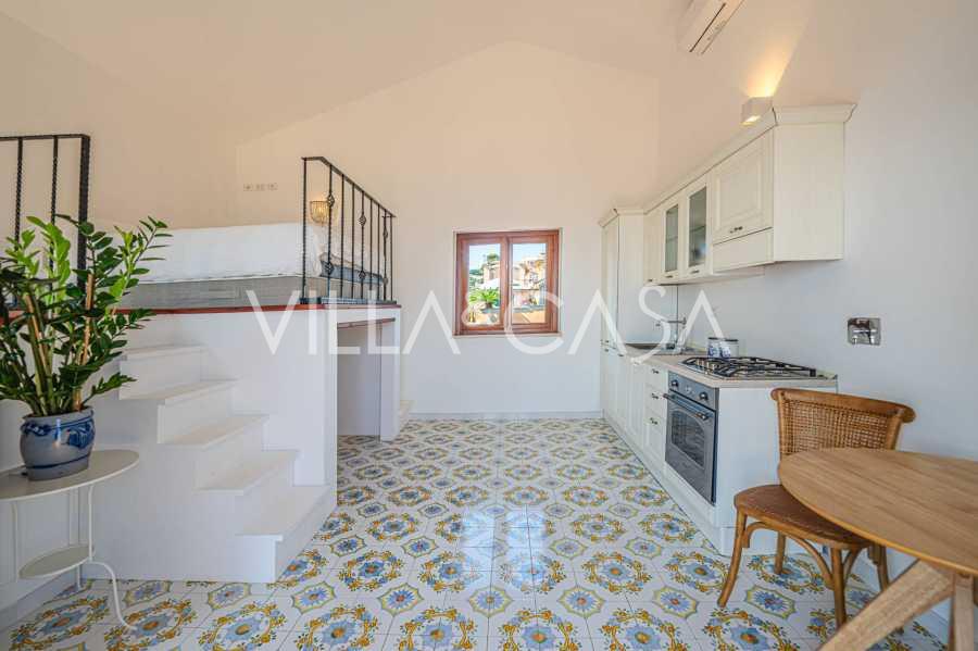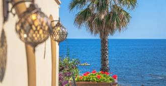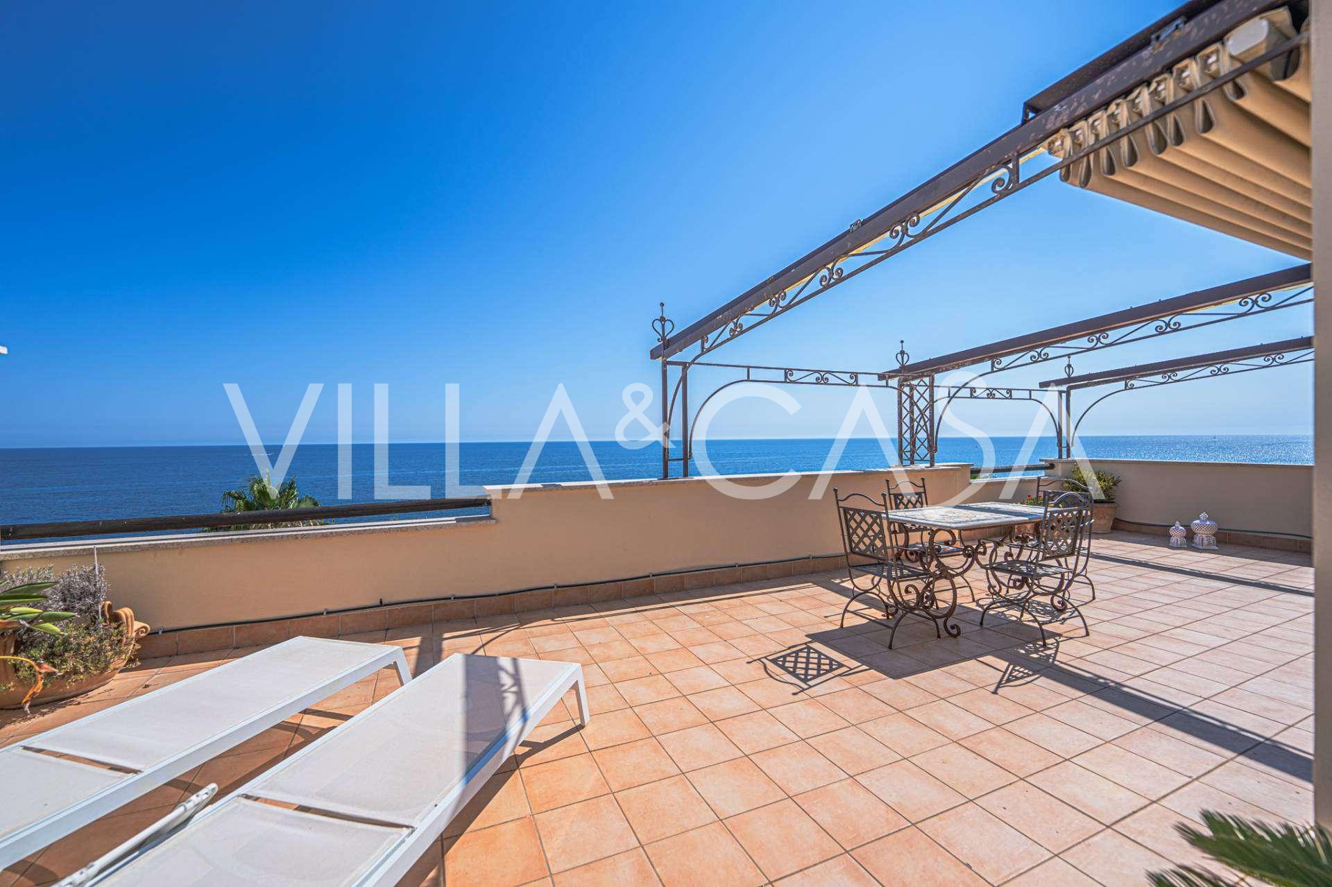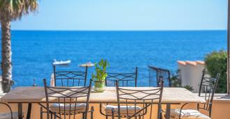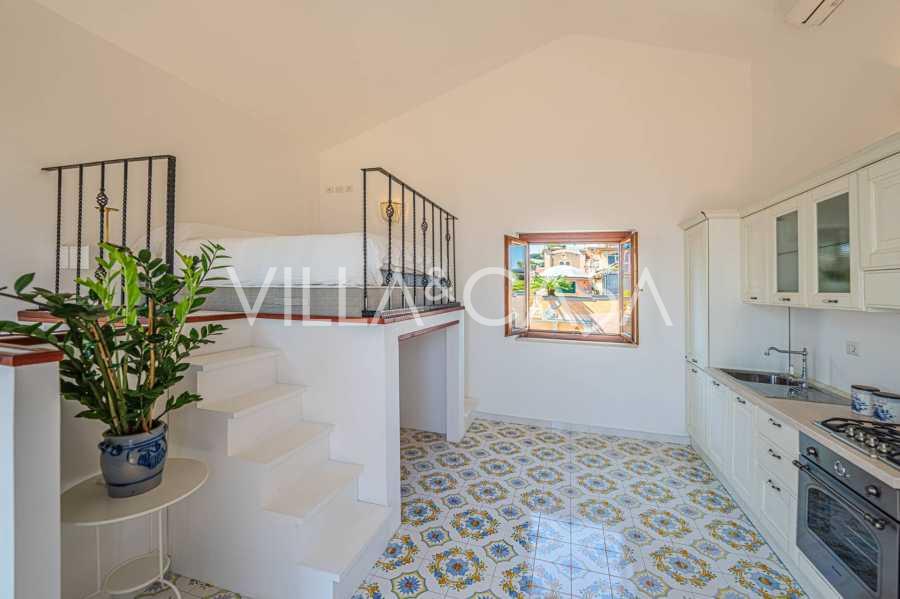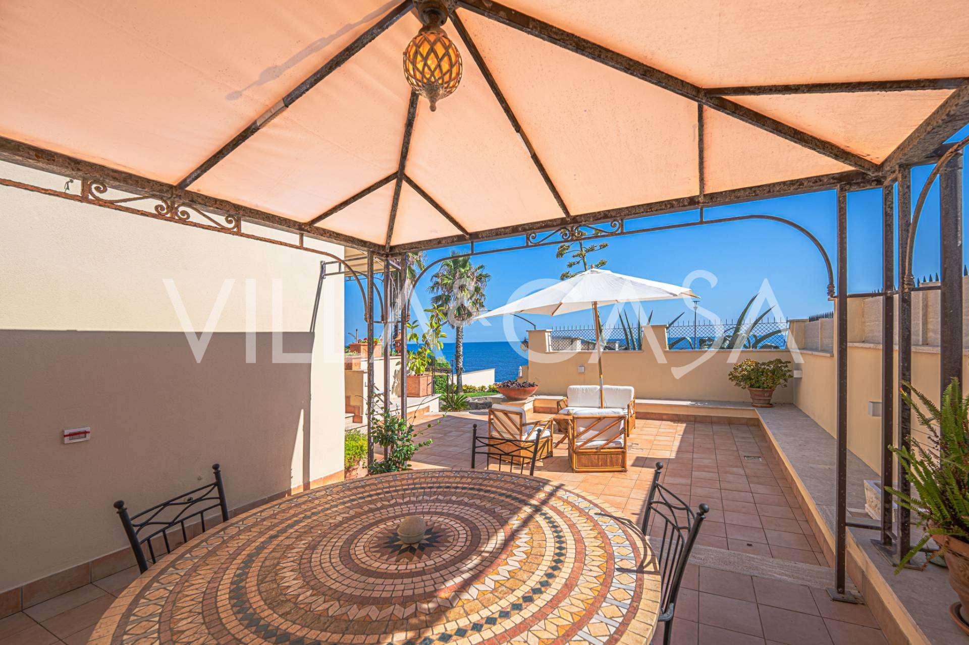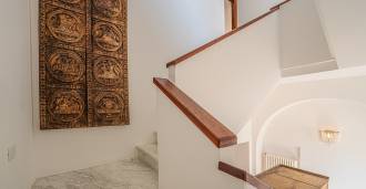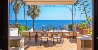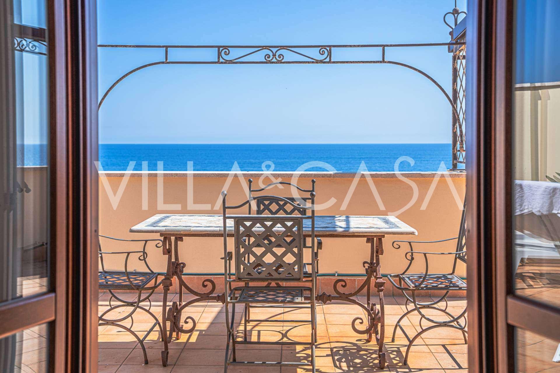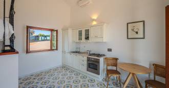 Окна предлагают панорамный 180-градусный вид на море, синий горизонт заполняет каждое внутреннее пространство и простирается до широких панорамных террас. Внутренние помещения, с высокими потолками более трех метров, терракотовыми полами того времени, мраморной лестницей и камином, создают атмосферу изысканной, вечной элегантности.