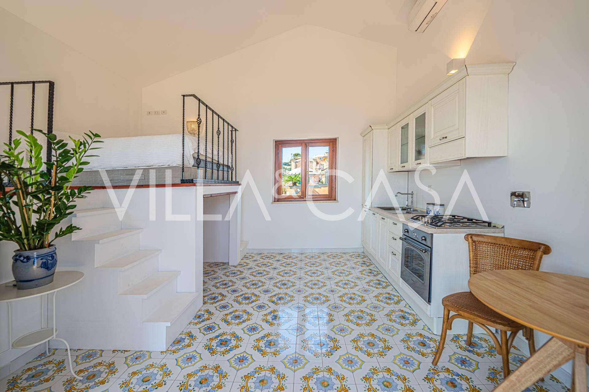 Резиденция занимает одну часть изысканного дуплекса, при этом обеспечивает полную независимость благодаря отдельному входу, просторному частному саду площадью около 800 квадратных метров и прямому частному доступу к пляжу, что является редкостью на побережье Лацио.