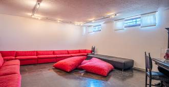 Подвальный этаж: элегантная таверна с зоной отдыха, отдельная кухня, кладовая, винный погреб, ванная комната и просторный гараж площадью 107 м².