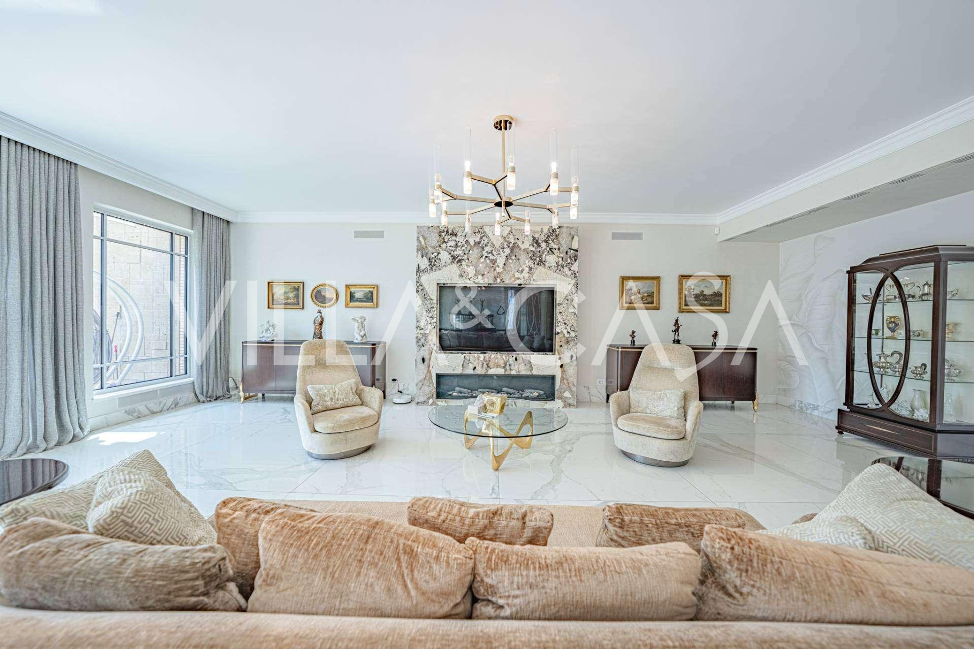Первый этаж: элегантный вестибюль, просторная гостиная с дизайнерским биокамином и панорамными окнами, ведущими на террасу; ультрасовременная кухня с техникой от ведущих брендов; отдельная служебная зона (прачечная, техническое помещение, отапливаемый гараж с прямым доступом в дом); приватный кабинет с собственной кухней и ванной.