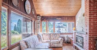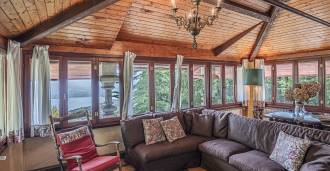 - Первый этаж (около 160 m²): просторный вестибюль, кухня, две кладовых, гостиная с камином и обеденной зоной с выходом на большую террасу с видом на озеро, широкий коридор, три спальни (одна с застеклённой верандой и панорамным видом), ванная и открытая терраса. На цокольном уровне четыре помещения для погребов.