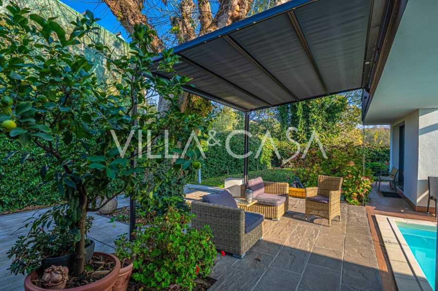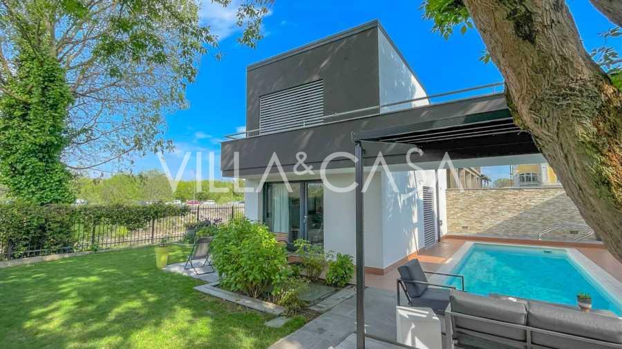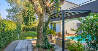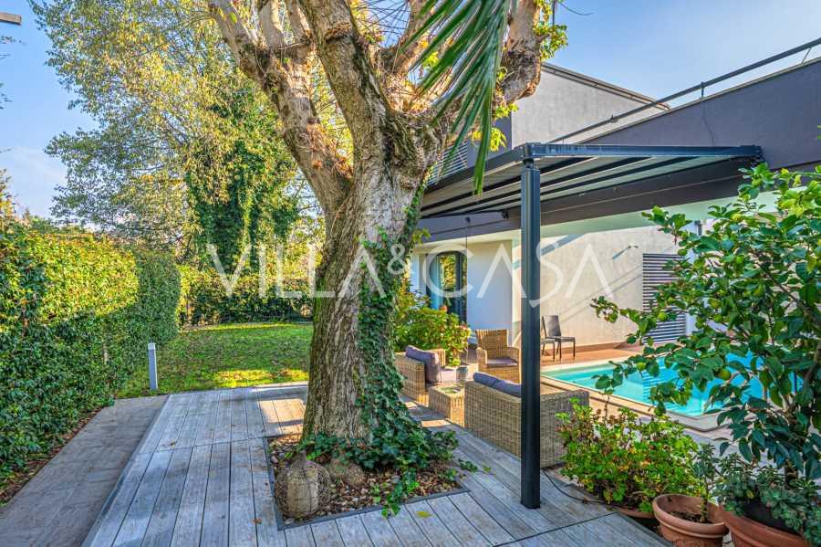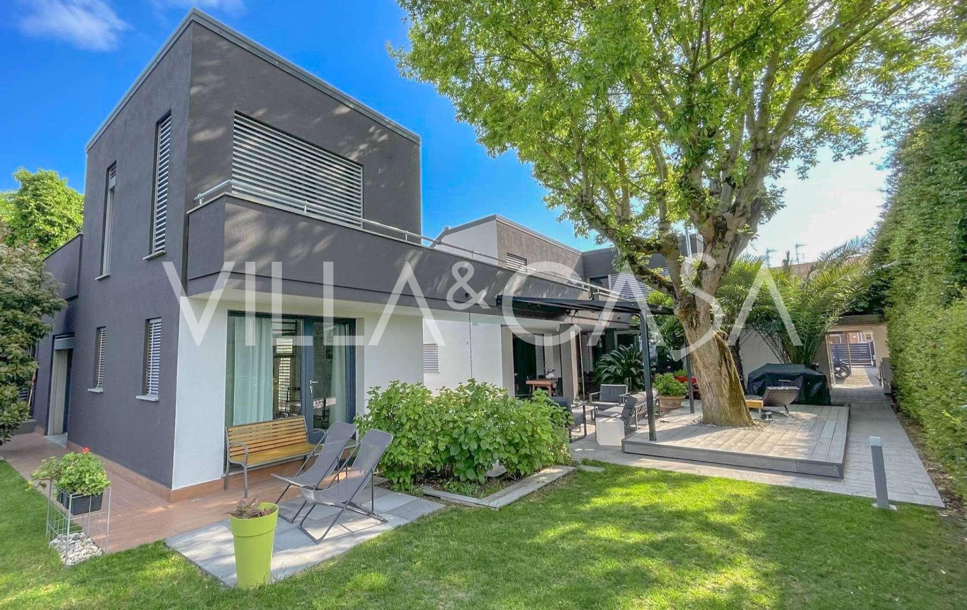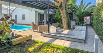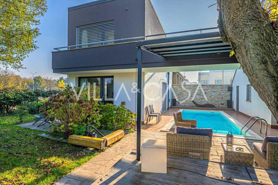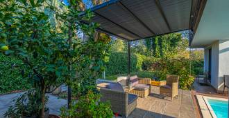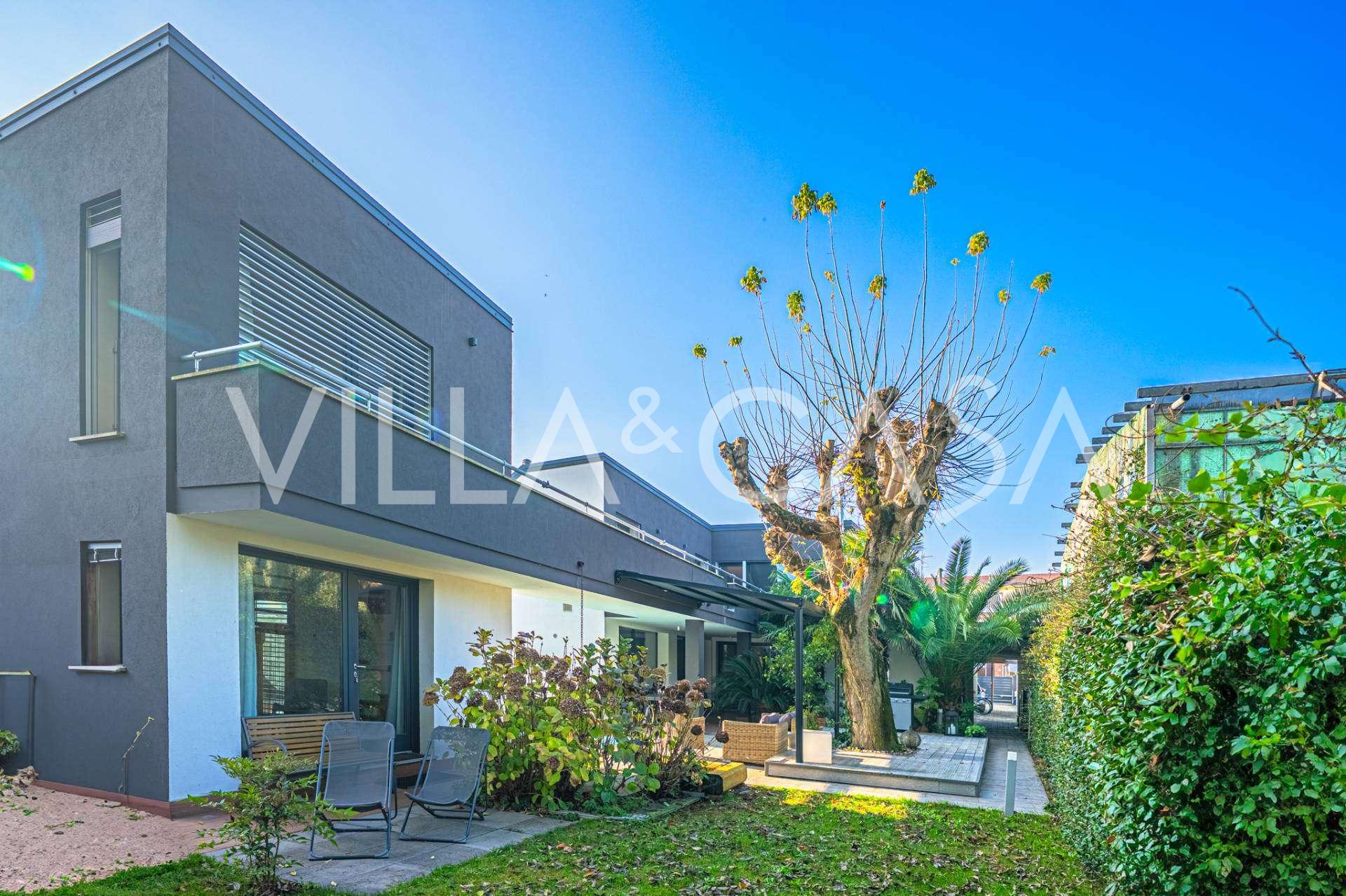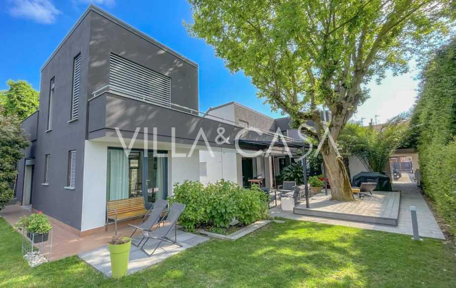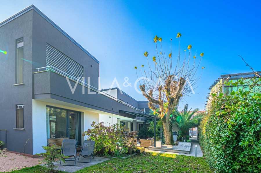 В самом центре Феррары, среди ухоженной зелени, продаётся современный дом, построенный в 2014 году, общей площадью около 360 м². Он разделён на две автономные части: основной дом и отдельный гостевой домик. Обе части объединяет просторная общая терраса на втором этаже, создающая цельное гармоничное пространство и открывающая вид на сад и зону отдыха.