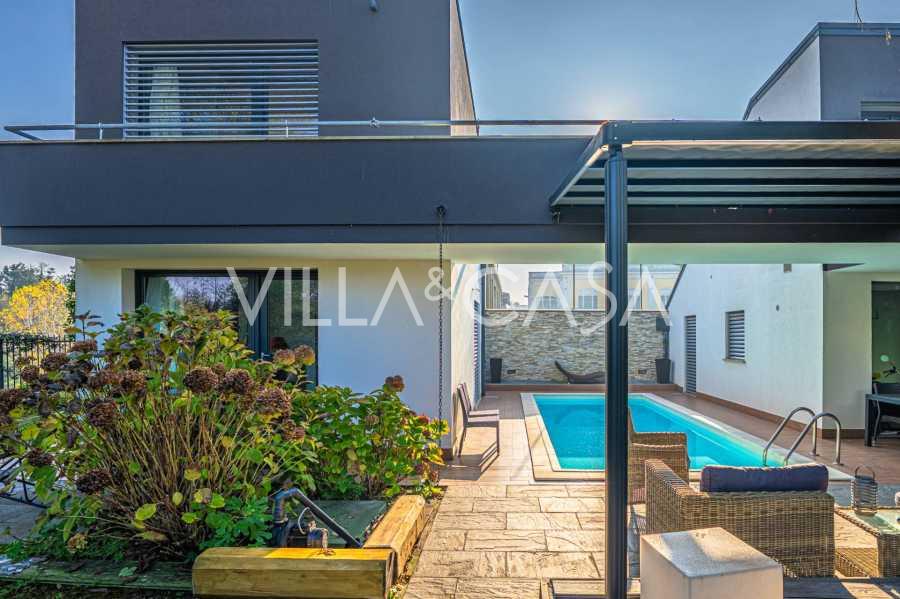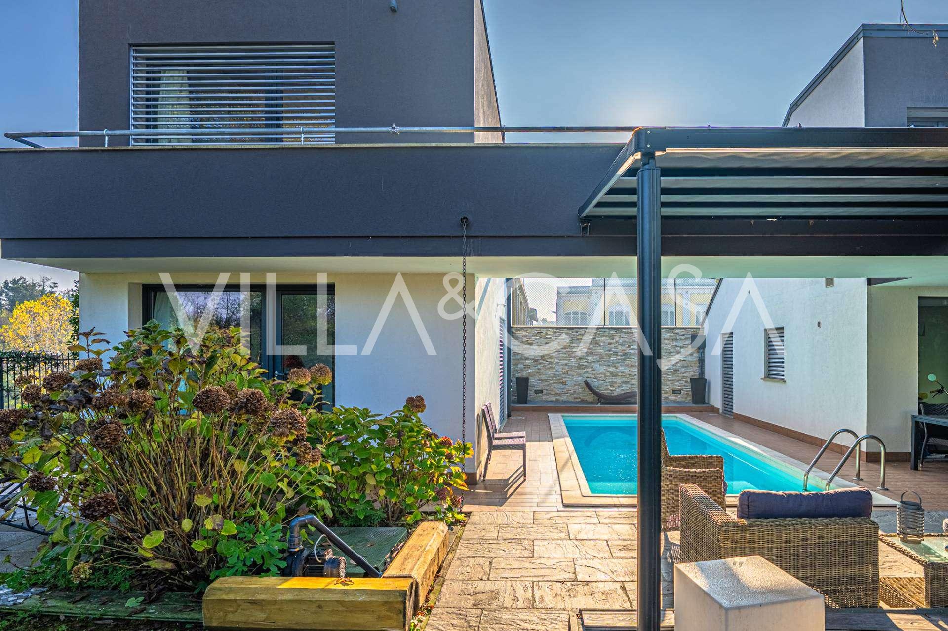 В сердце города Феррара, окружённый ухоженной зеленью, на продажу предлагается современный дом, построенный в 2014 году, общей площадью около 360 м². Он разделён на две самостоятельные части: основной дом и отдельный гостевой домик. Они соединены просторной общей террасой на втором этаже, создающей ощущение единого пространства и открывающей прекрасный вид на сад и зону отдыха.