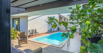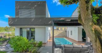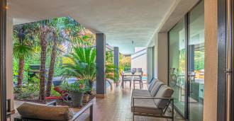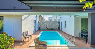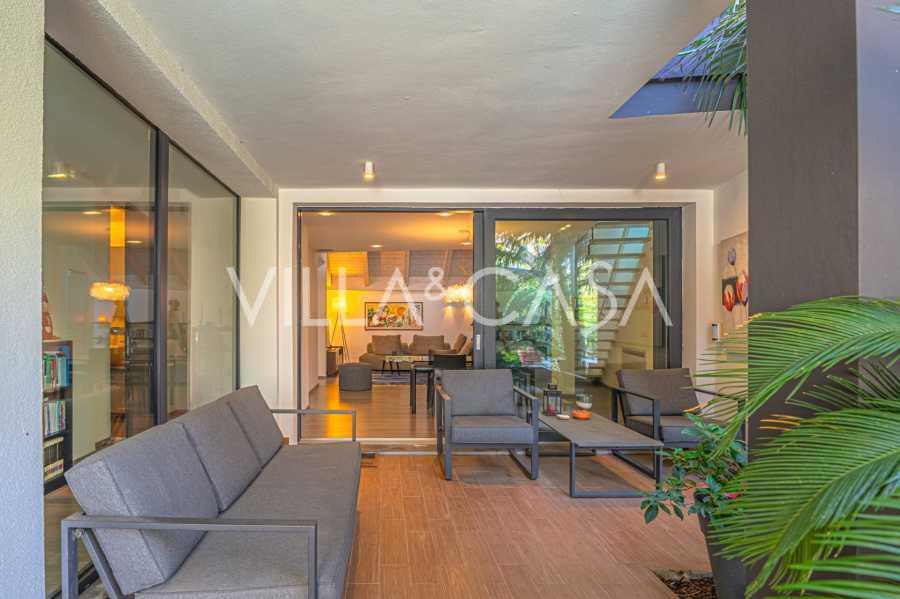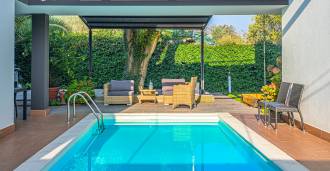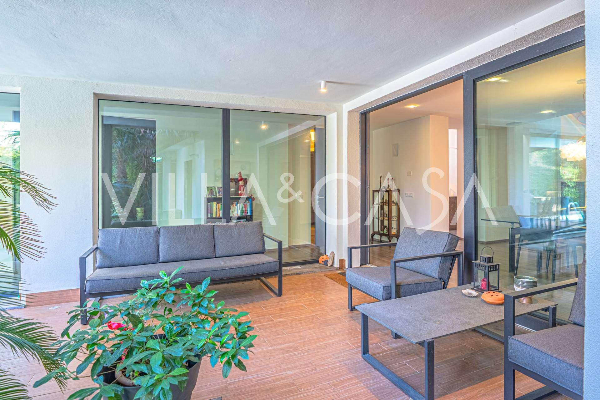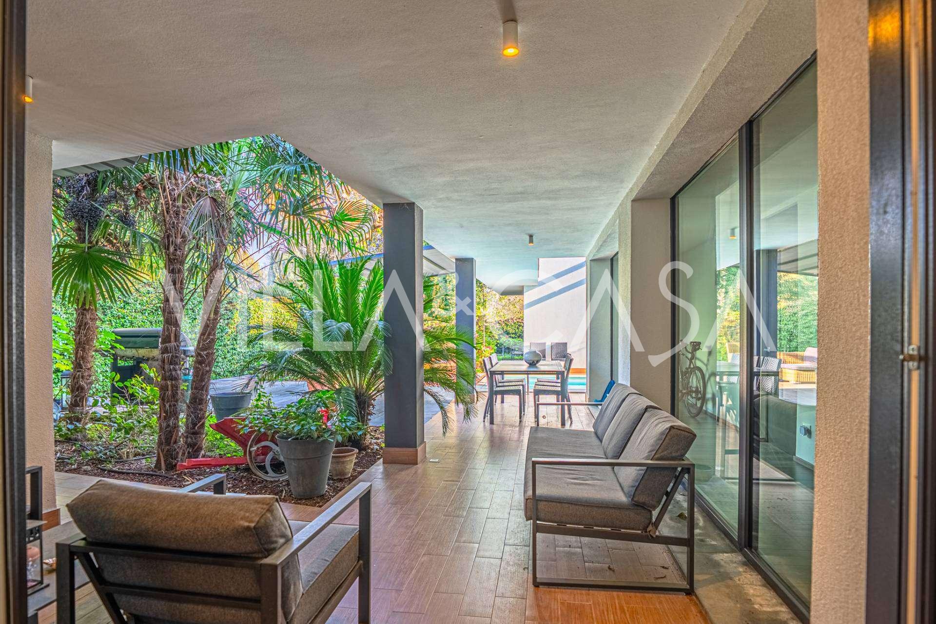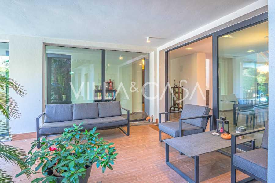 На участке расположен ухоженный сад, большой открытый бассейн, гараж и 4 крытых парковочных места, зона для барбекю и несколько террас, одна из которых крытая для комфортного отдыха даже в ненастную погоду.