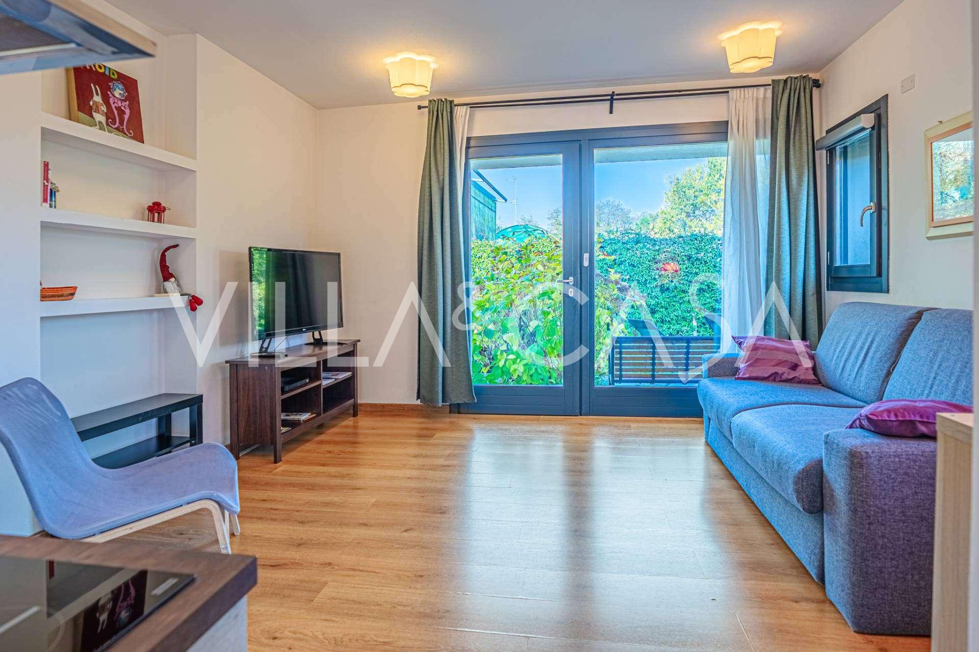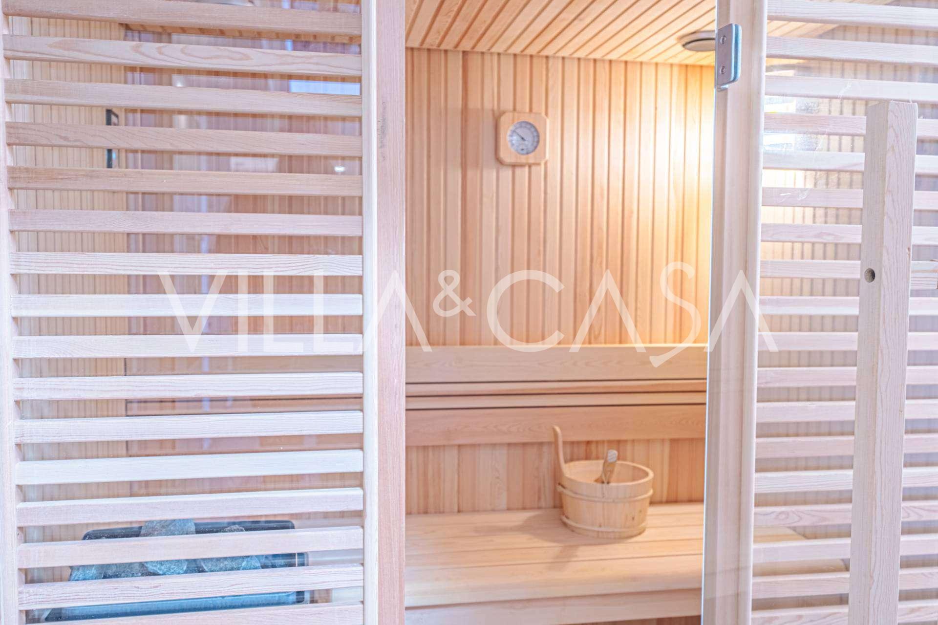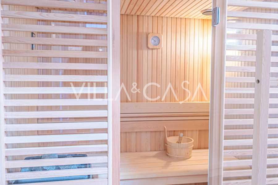 Первый этаж: светлая гостиная с выходом на большую крытую террасу и сад, современная кухня с новой техникой, уютная зона барбекю, главная спальня с собственной ванной и гардеробной, дополнительная ванная комната для гостей, финская сауна, вторая спальня с ванной комнатой.