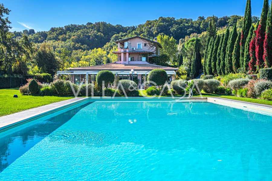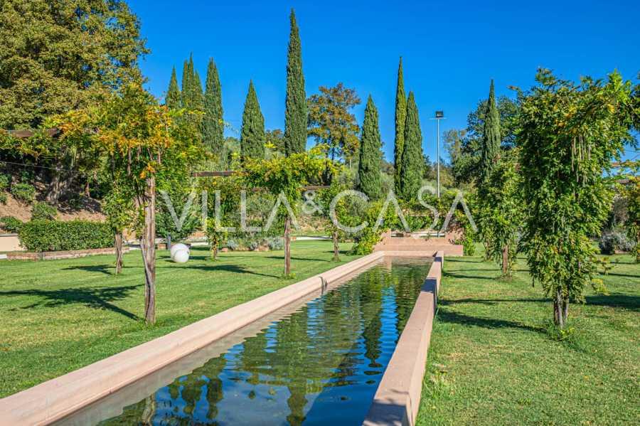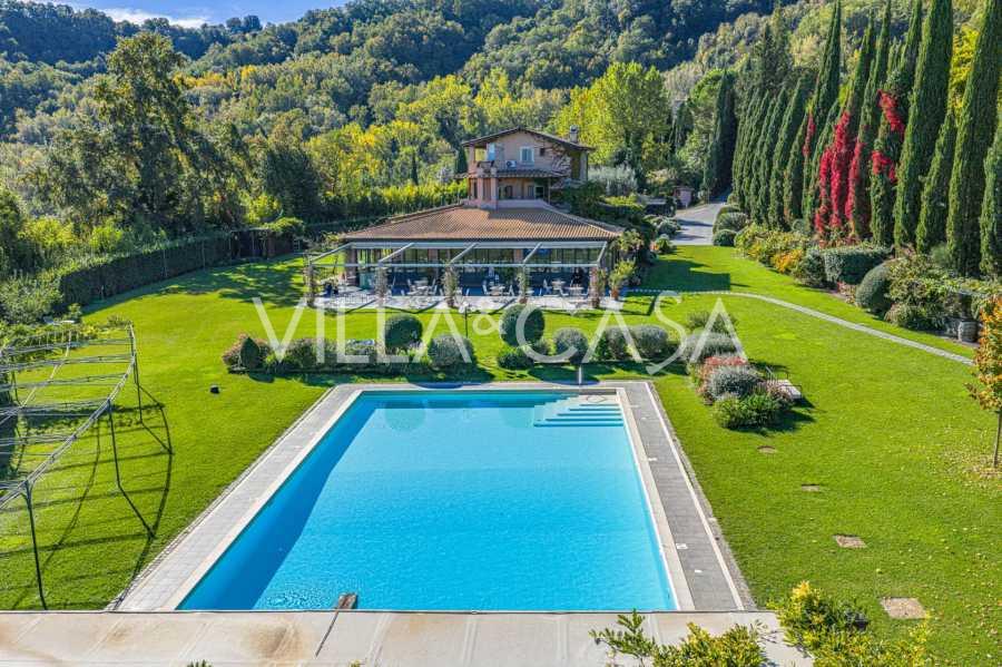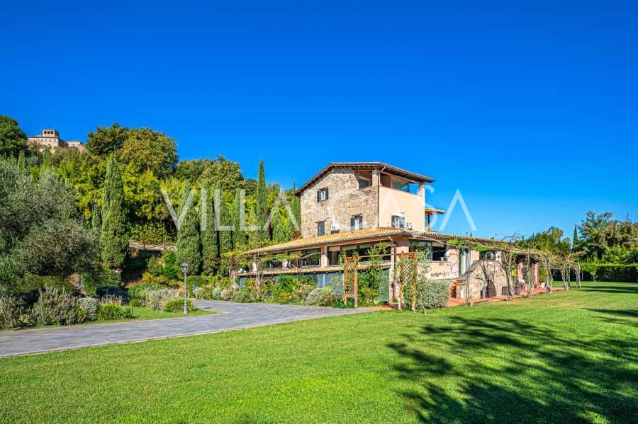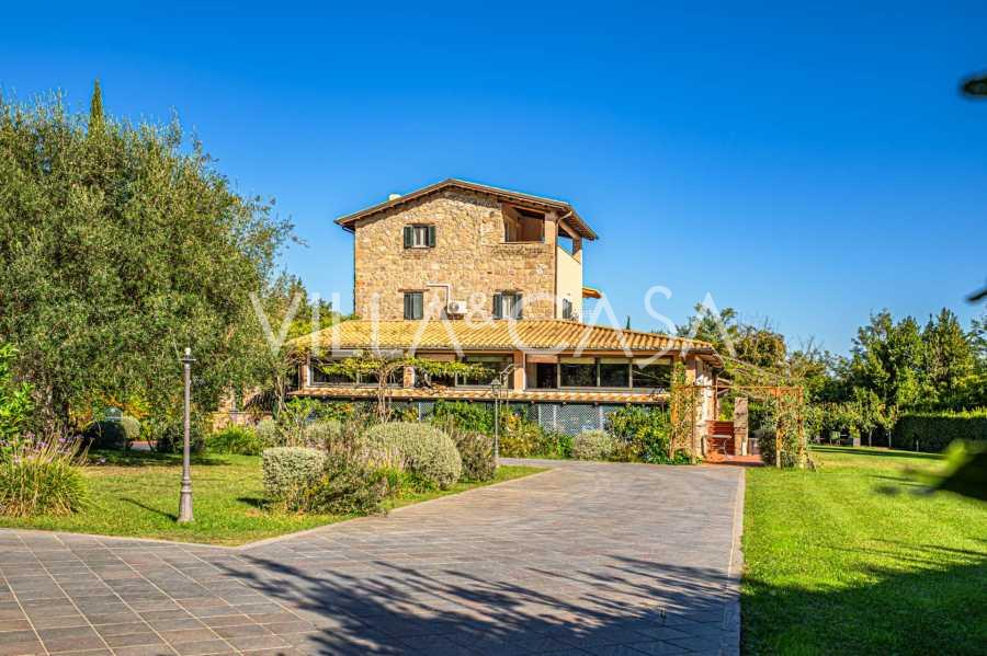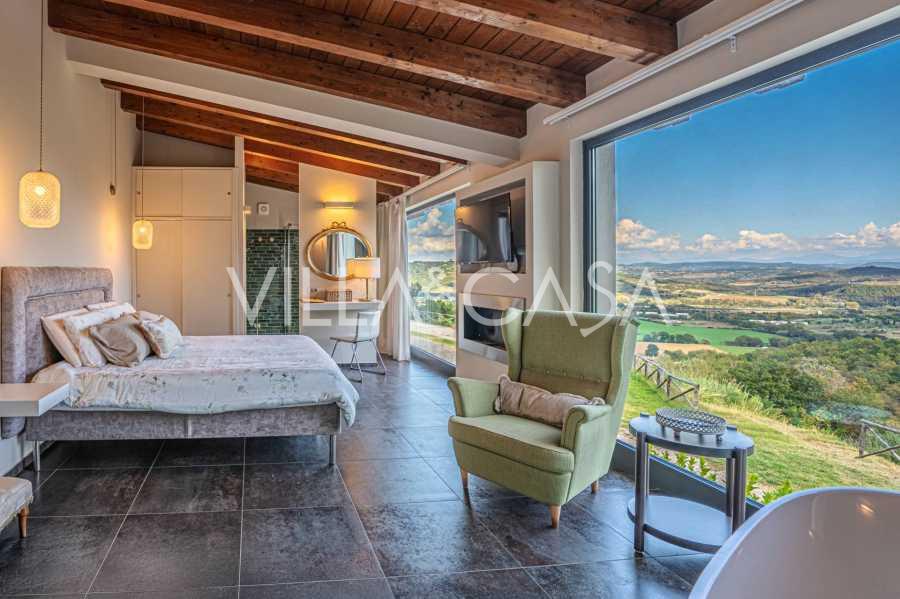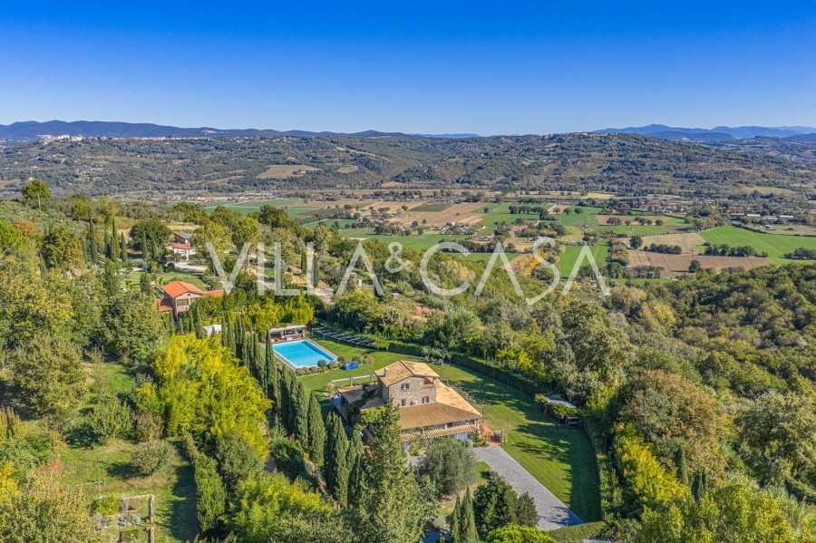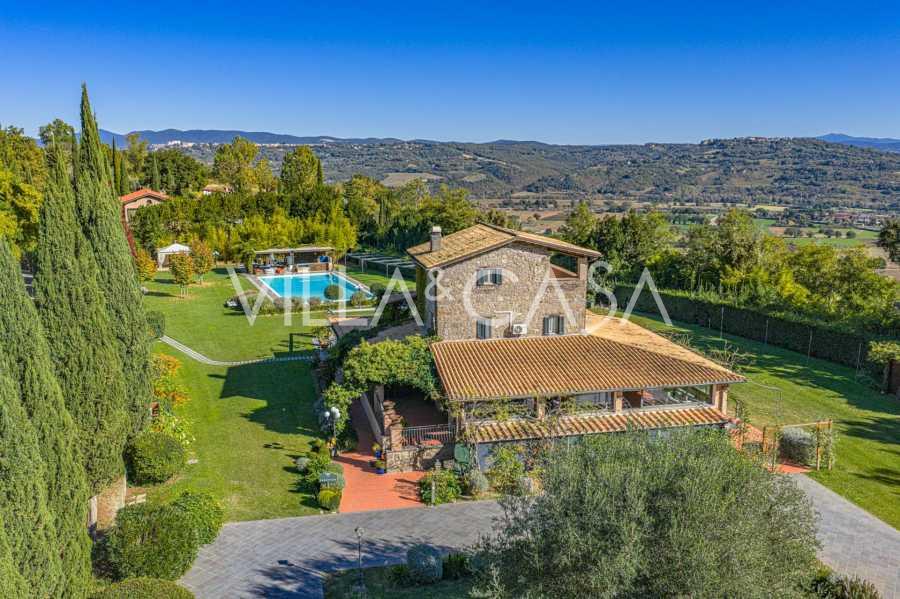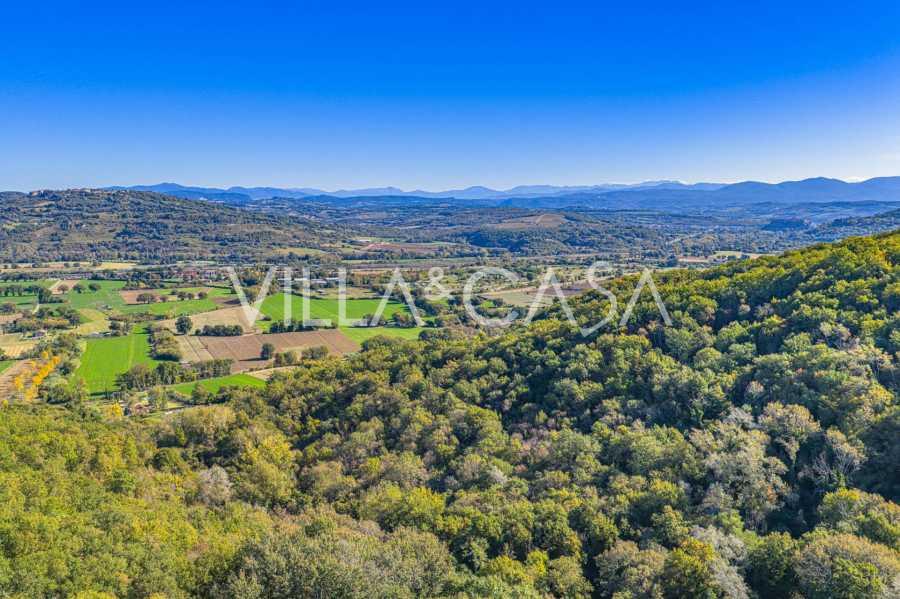 В провинции Витербо, на возвышенности холмов, открывается потрясающий вид на долину Тибра. Поместье занимает около 25 гектаров ухоженного парка, создавая атмосферу полного покоя и уединения. Каждый уголок спроектирован для комфорта, элегантности и гармонии: солнечные террасы, беседки, изящные шезлонги у бассейна и тенистые аллеи, окруженные вековыми деревьями.