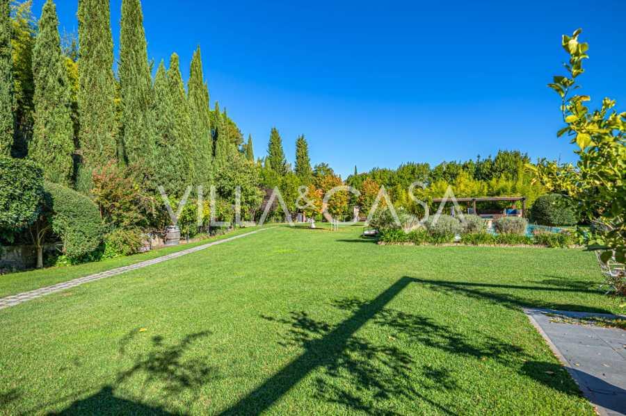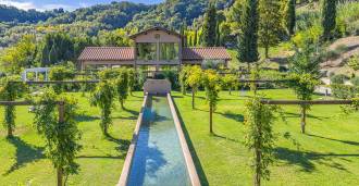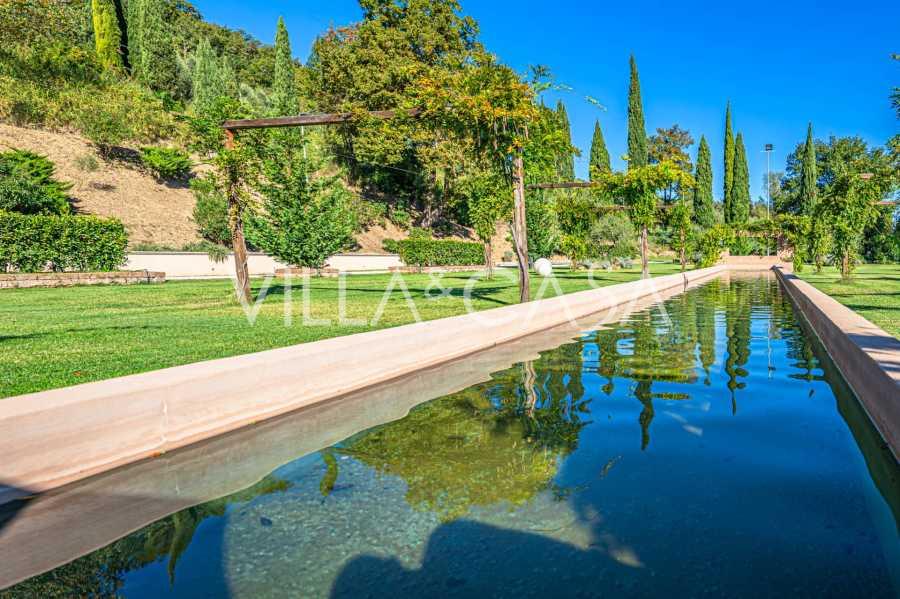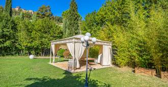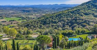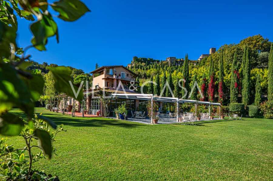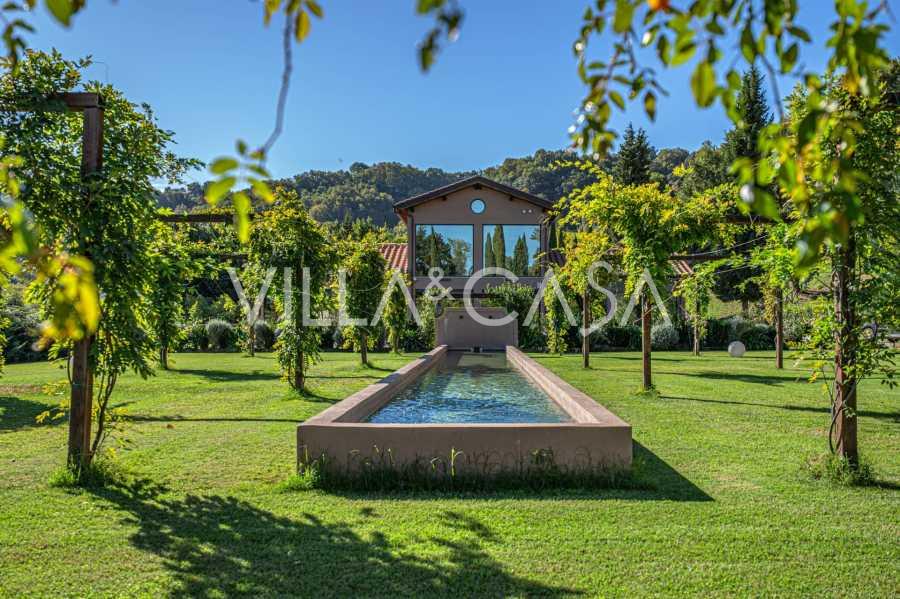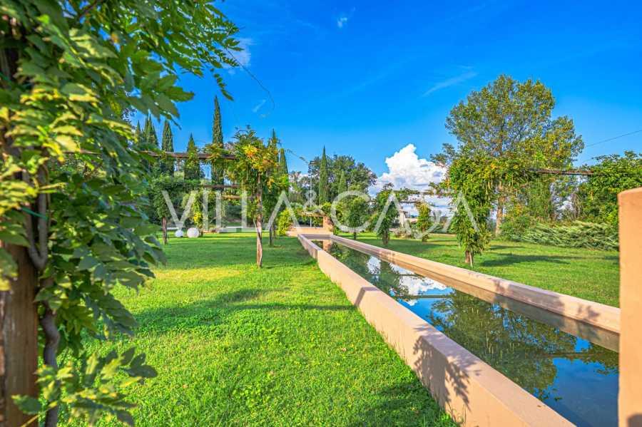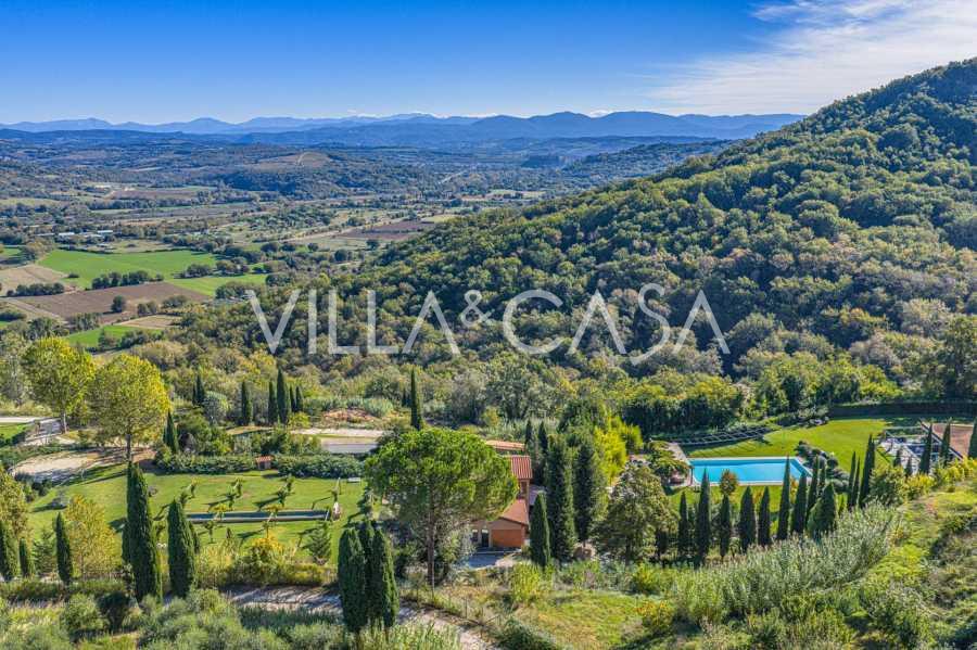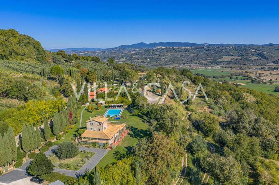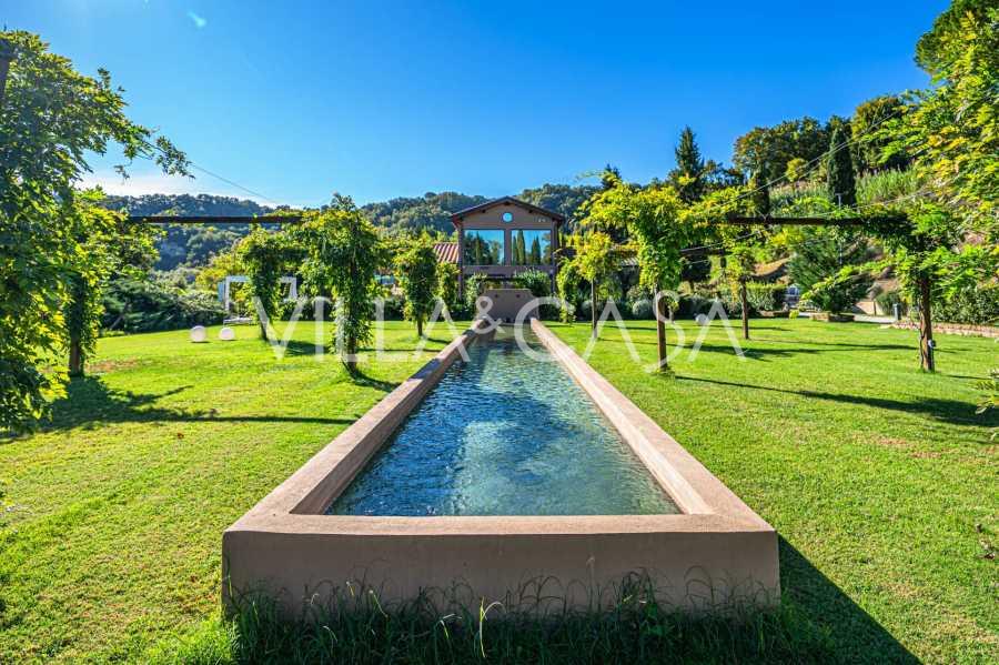 В провинции Витербо, на возвышенности холмов, открывается потрясающий вид на долину Тибра. Поместье занимает около 25 гектаров ухоженного парка, создавая атмосферу полного покоя и уединения. Каждый уголок спроектирован для комфорта, элегантности и гармонии: солнечные террасы, беседки, изящные шезлонги у бассейна и тенистые аллеи, окруженные вековыми деревьями.