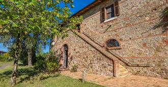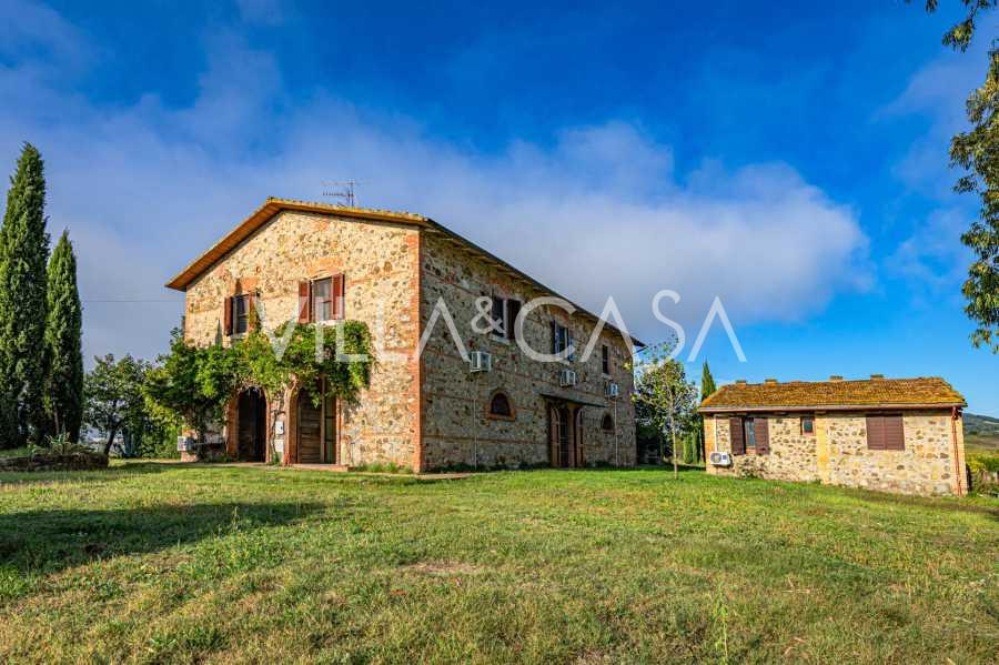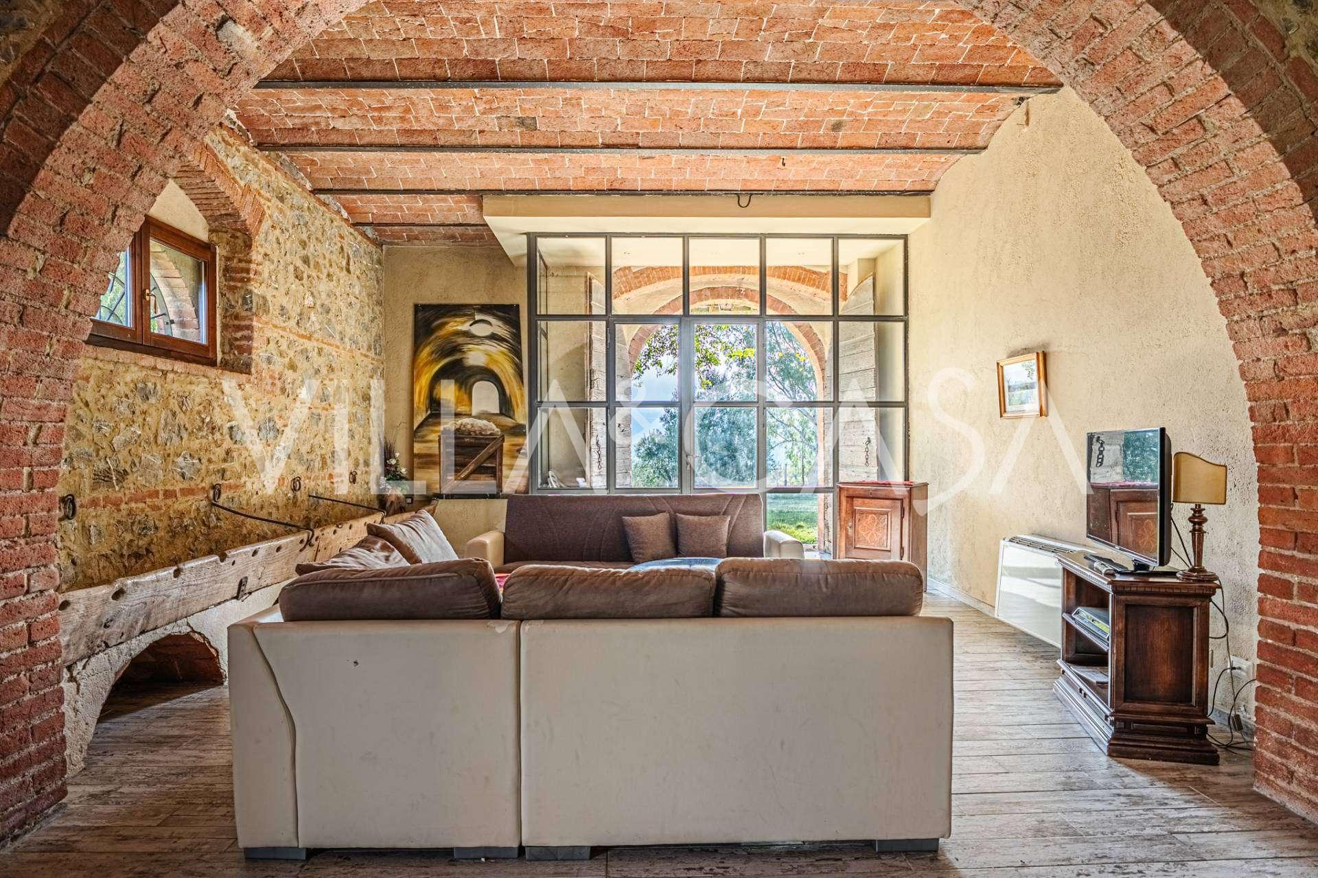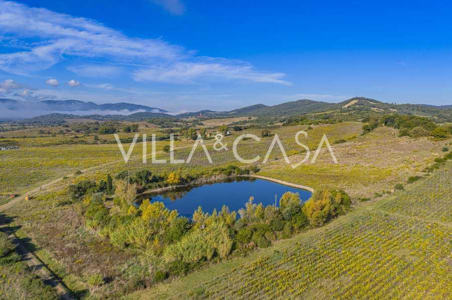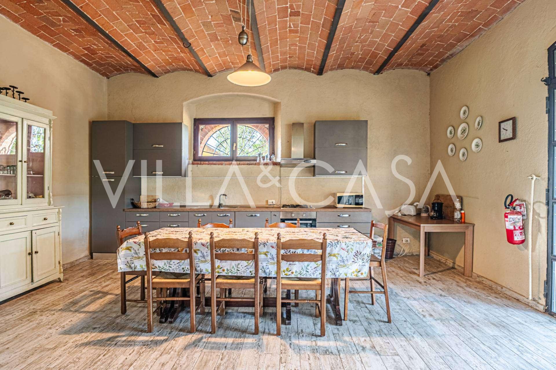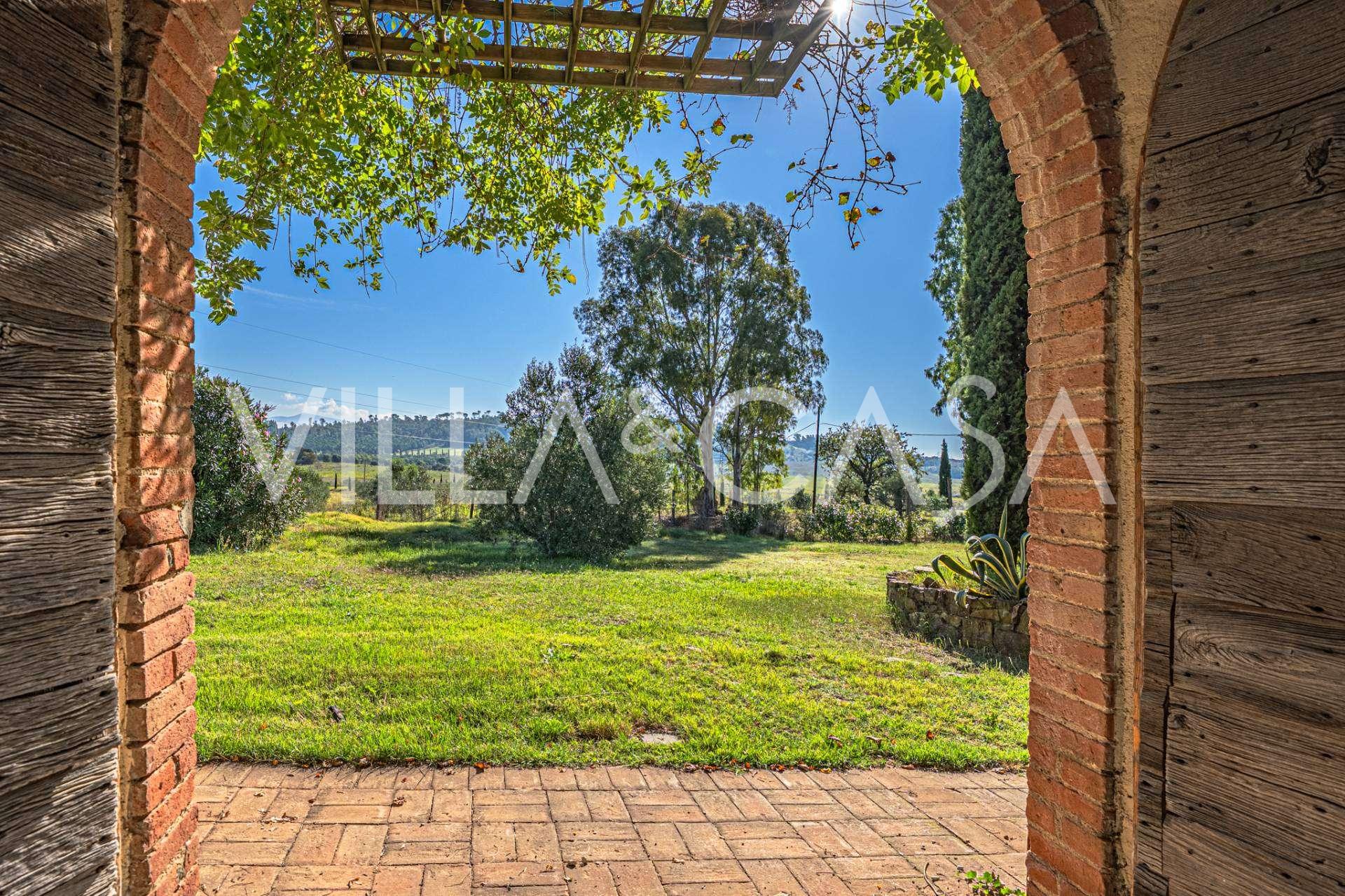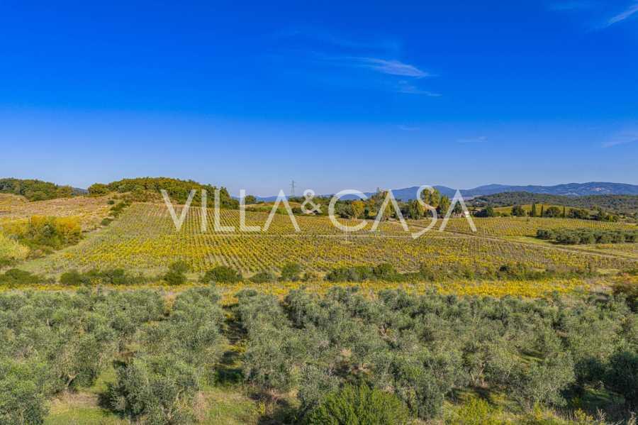 У подножия дома в тишине природы размещен великолепный бассейн с зоной солярия, окруженный живыми изгородями и цветущими клумбами. На территории также есть два гектара виноградников, оливковая роща и плодородные поля, создающие неповторимую тосканскую атмосферу.