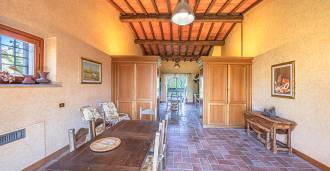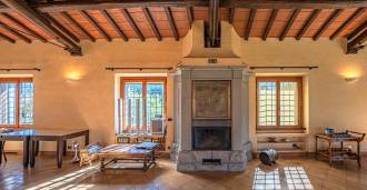 На первом этаже, занимающем около 140 м², который когда-то был старинной конюшней, сейчас находится просторный зал с деревянными балками на потолке, освещённый множеством окон с видом на сад. Центральное место занимает массивный камин из редкого серого мрамора пеперино, изготовленный местными мастерами. Здесь же находится просторная кухня с зоной для приготовления еды, дровяным камином и печью, а также отдельная обеденная зона, просторный вестибюль, спальня и две ванные комнаты.
