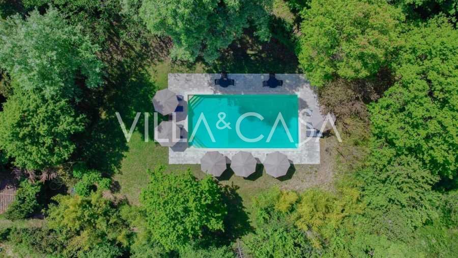 Владение включает около 1200 кв.м жилой площади и расположено на 40 000 кв.м земельного участка, с ухоженными садами, оливковыми рощами и впечатляющими панорамами, создающими атмосферу спокойствия и уединения. Комплекс состоит из шести независимых резиденций, четырёх домов и двух коттеджей, в которых находятся 15 спален и 15 ванных комнат. Каждое помещение имеет отдельный вход, полностью оборудованную кухню, светлые гостиные и свою зону отдыха на открытом воздухе.